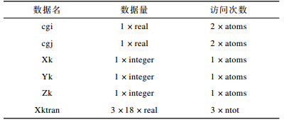 1) 针对从核访存速度过慢的问题, 本文选择将从核计算中需要用到的部分数据暂存在从核LDM中。首先这些数据要在从核计算过程中被频繁访问, 从核访问LDM要比直接访问主存快很多, 如果被频繁访问的数据放到从核LDM中, 则在从核计算过程中可以直接从LDM中读取数据, 无需多次访问主存。其次这些数据要足够小, 从核LDM只有64 KB, 不足以存储从核计算过程中的所有数据, 因此选择数据量较小且在计算过程中被频繁访问的数据存放到从核LDM中, 从而加速访存时间, 提升程序性能。这些数据主要包括原子电荷(cgi和cgj)和系统原子坐标参数(Xk、Yk和Zk), 其中电荷以real类型、坐标以integer类型存储在Common区, 在计算短程非键力的过程中被访问的次数与系统原子总个数(atoms)成正比, 如表 2所示。