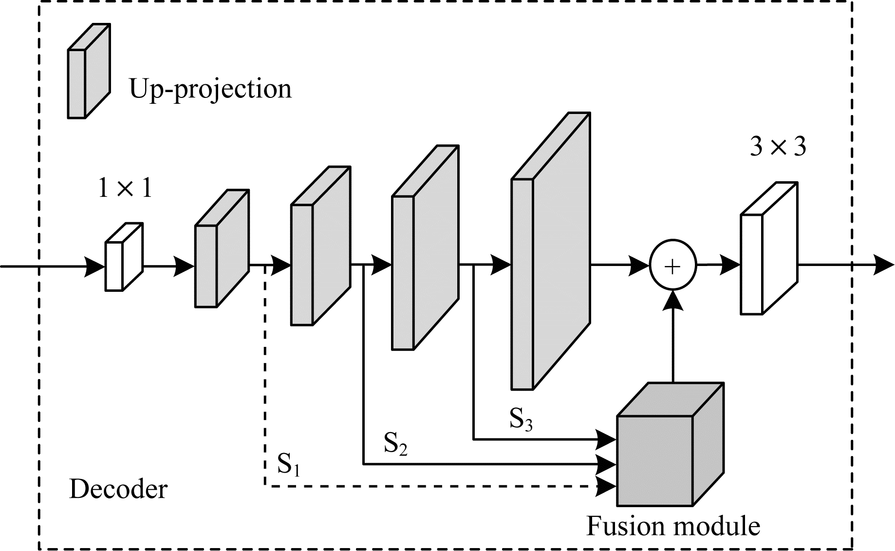 解码器的多层级融合思想主要来源于FPN网络结构[20], FPN通过构建特征图金字塔, 融合多种分辨率下的特征, 以提高获取更高级别图像语义的能力。在本文解码器中, 上投影模块输出的特征图可看作是多分辨率下的特征, 因此采用多层级融合结构融合多分辨率特征, 以提升网络性能。