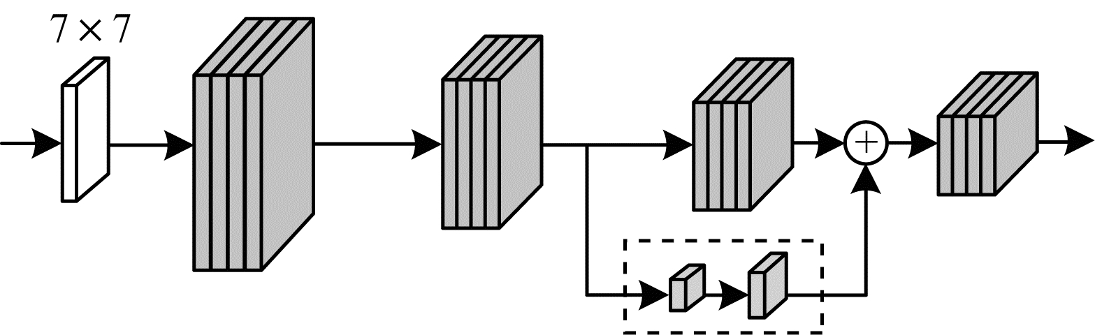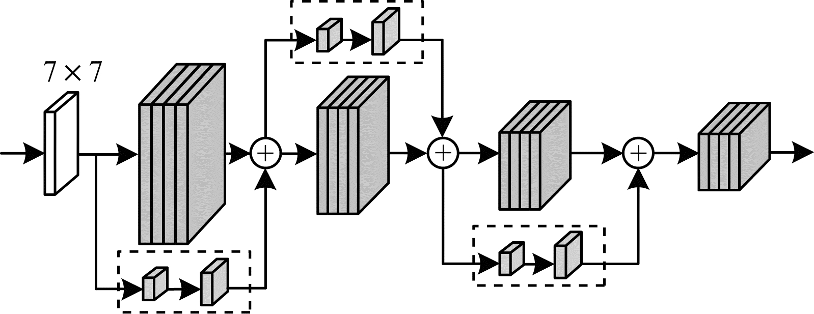 多层级融合的结构形式有很多种, 图 3、图 4表示编码器的2种其他结构。图 2采用了2个跨层级调整模块, 分别应用在Block-1及Block-2输出端。在图 3中, 只保留了图 2中Block-2输出端的一个跨层级调整模块。图 4则在图 2的基础上, 在7×7卷积层输出端添加一个跨层级调整模块。下文将通过实验验证上述3种编码器结构的性能。