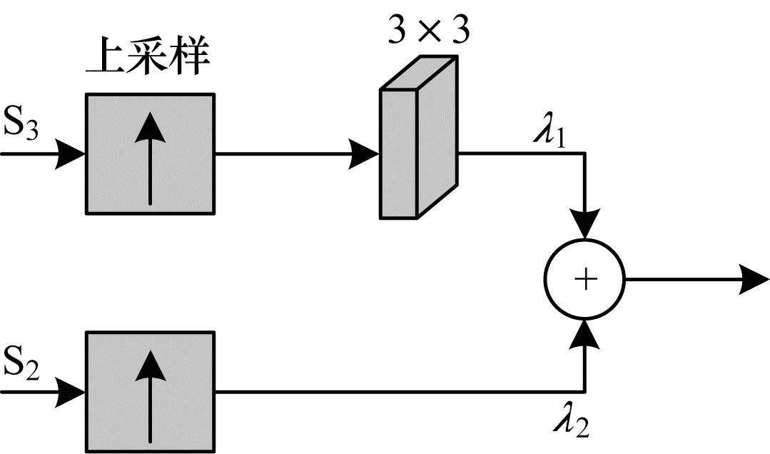 解码器多层级融合模块结构如图 6所示, 第2层、第3层上投影模块的输出分别为S2、S3。其中, S3经过上采样、3×3卷积处理, 再经过超参数λ1加权后, 与S2经上采样、超参数λ2加权结果相叠加后输出。融合模块的目的是将感受野更大的S2和S3叠加至感受野较小的S4上, 由于S3相对S2感受野小, 因此在融合模块中对S3增加一个3×3卷积进行调整。如果融合模块的输出Sf与主干输出S4直接相加, Sf会干扰预测深度图的精度, 因此本文使用2个较小的超参数λ1和λ2对S3和S2削弱, 降低融合模块输出数据对主干数据的影响。
