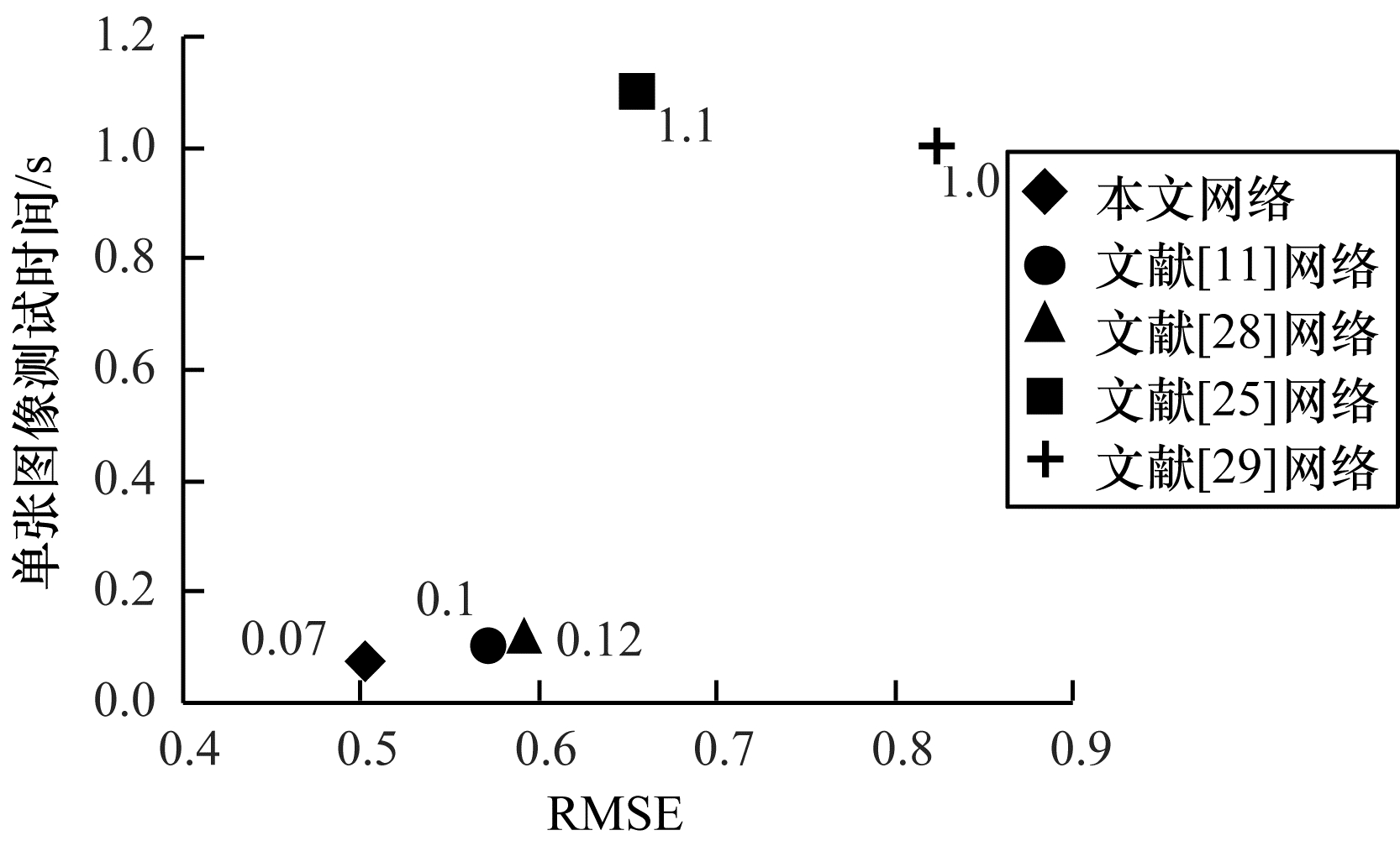 图 7 本文网络与先进网络的测试时间与RMSE对比 Fig. 7 Comparison of test time and RMSE between the proposed network and advanced network |