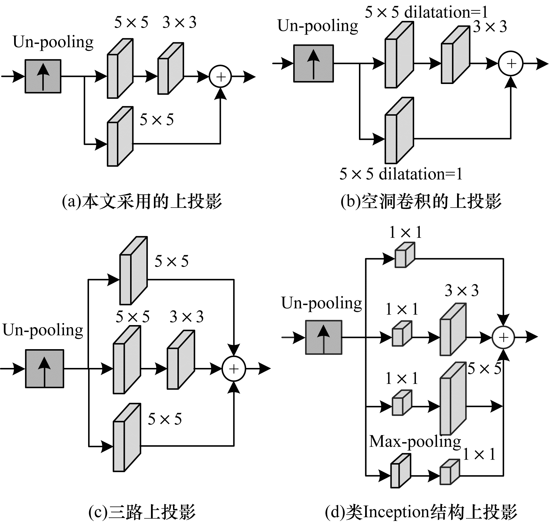 上投影模块的结构有很多种, 本文列举了4种典型结构进行对比, 如图 9所示。其中, 图 9(a)是本文采用的上投影结构, 图 9(b)中2个5×5卷积核均采用空洞卷积的方法来增加感受野, 其膨胀率为1, 图 9(c)增添了一条跳跃连接, 期望获取更多的局部特征和细节信息, 图 9(d)用Inception-v1替代双路卷积部分, 用以简化计算量。