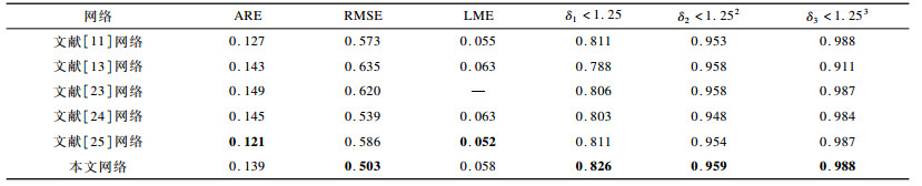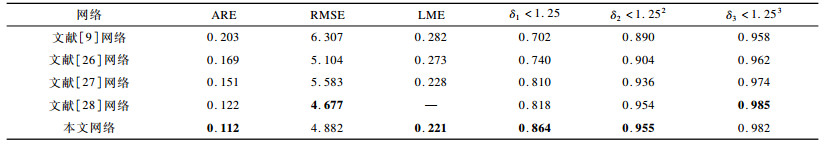 2.4 实验结果与对比为了验证本文方法提出网络结构的有效性, 分别在NYUv2和KITTI数据集上进行训练与测试, 为保证对比的公平性, 实验将深度距离上限设置为80 m, 并将得到的实验结果与文献[9, 11, 13]、文献[23-25]、文献[26-28]方法进行对比, 具体如表 1、表 2所示。其中, 最优结果加粗表示。