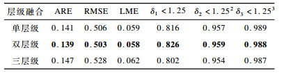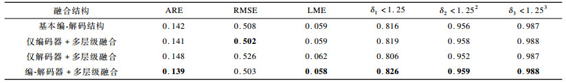 3.1 多层级融合结构测试为了验证本文提出的多层级融合结构对网络性能的提升, 实验对以下4种结构进行对比:第1种是基本编-解码结构, 没有跨层级的融合; 第2种仅在编码器中增加多层级融合; 第3种是仅在解码器中增加多层级融合结构; 第4种是编-解码器两者都加入多层级融合, 结果如表 3所示。其中, 最优结果加粗表示。从表 3可以看出:当同时采用2种融合结构时, 有5个评价指标结果达到最优, 这说明了本文提出的多层级融合结构对深度预测任务有效; 此外, 仅对编码器添加多层级融合结构时, 网络性能也得到了提升; 仅当在解码器添加多层级融合结构时, 网络性能反而下降, 这可能是由于编码器与解码器的能力不匹配而导致的结果。