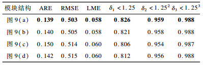 其中, y*为真实深度值, y为预测深度值, 式(5)中的thr=1.25, 1.252, 1.253。在深度图质量评价指标中, δ1 < 1.25是评价深度信息准确度最重要的指标, 其反映整个深度图中深度准确像素的占比。