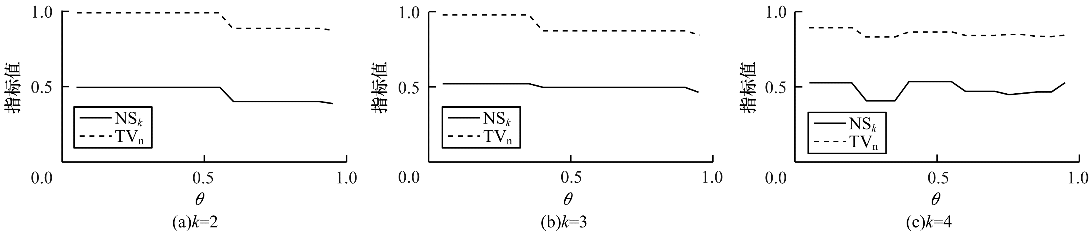 截断阈值θ是控制子区划分中一个关键参数, 其取值直接决定了分区效果。本文选取晚高峰期(t=69)时的路网进行划分。当分区数k=2~4时, θ值对NSk与TVn的影响如图 3所示。