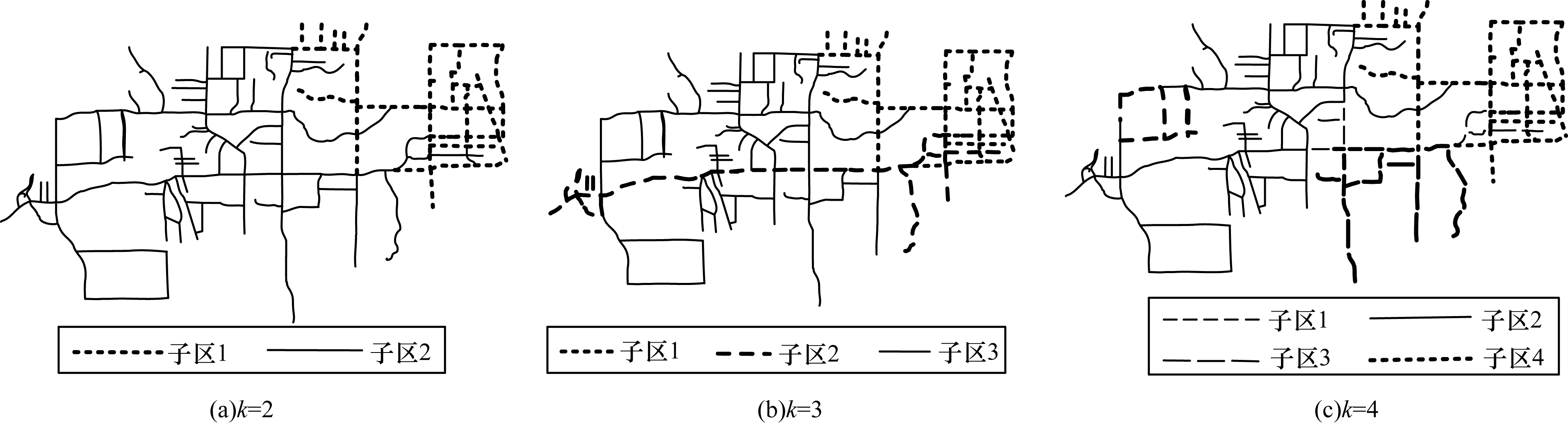 由图 3可见, 在不同分区数下, NSk与TVn指标值随着θ的增大逐渐变小, 表明算法的划分性能逐渐增强。控制子区数k分别为2、3、4时, 路网的最优θ值为0.95、0.95、0.25, 此时NSk与TVn最小, 即算法的划分效果最佳。最优θ值下的路网评价指标如表 1所示。