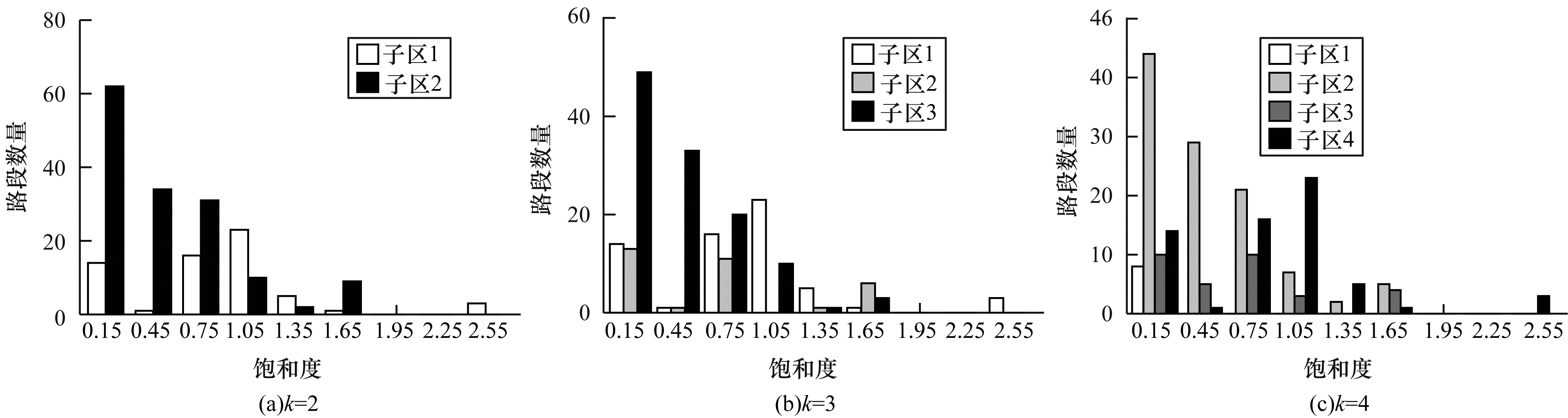 t=69时刻的控制子区静态划分结果如图 4所示。结合图 5中各控制子区内饱和度的频率分布可知:当t=69时, 2分区时的子区2内部通畅, 多数路段的饱和度集中在0.2~0.5, 子区1为饱和区域; 4分区下的3、4子区内饱和度相似, 但连接两者的公共路段较少, 因此, 将其划分为两部分。由于执行了子区边界平滑处理, 因此各控制子区内部完全连通, 为交通信号控制策略提供了准确的依据。