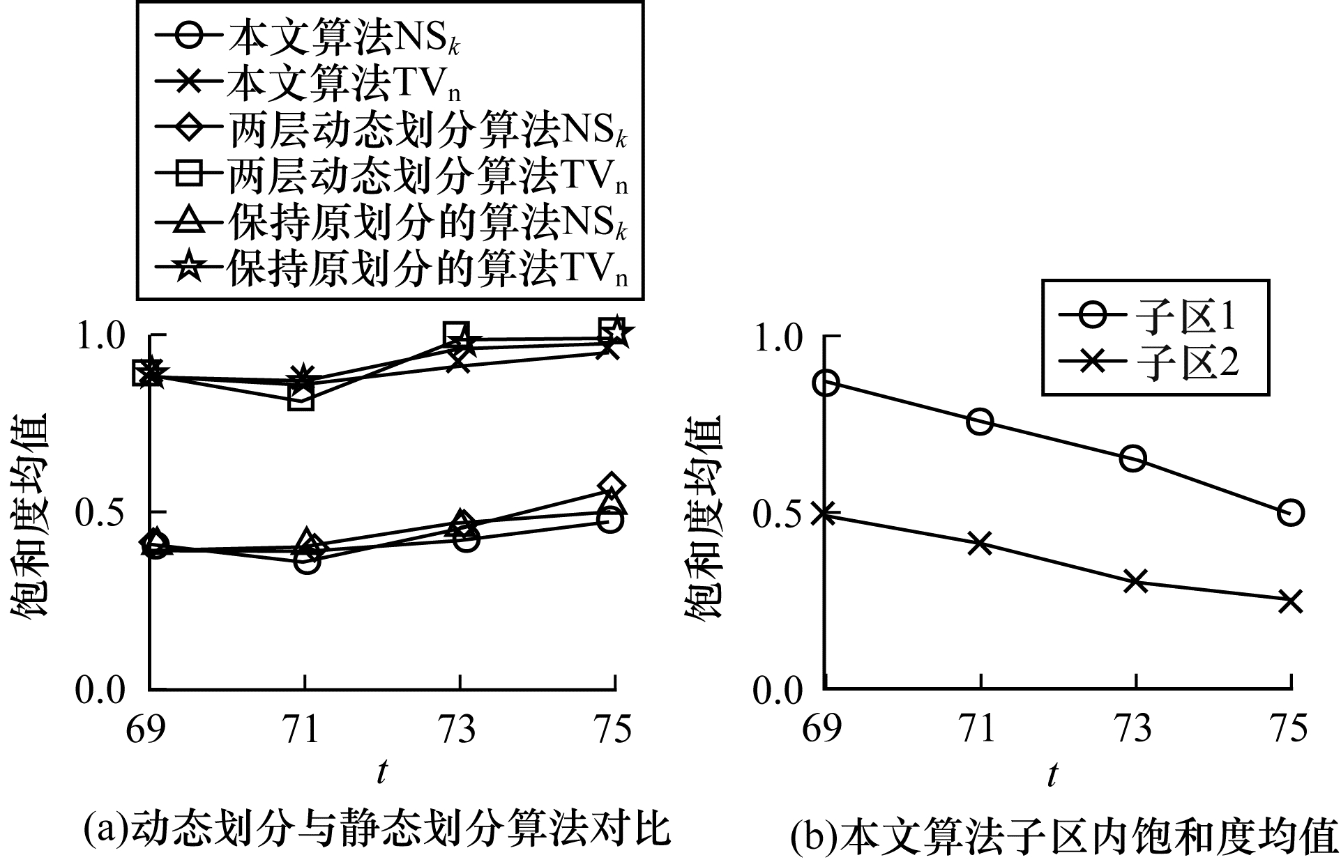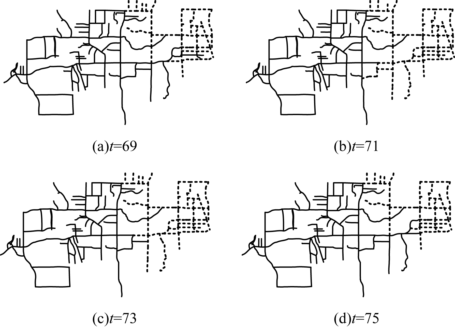 由图 7(a)可见, 本文算法与两层动态划分算法[13]在大部分时刻的划分结果相较随着时间的步进一直保持原划分结果的静态划分具有更好的效果。其中, 本文算法在除t=71时的其他划分结果相较两层动态划分算法性能更好, 体现了本文算法的有效性。由图 7(b)可见, t=69~75时段内2个控制子区的饱和度逐渐减小, 说明路网处于拥堵消散阶段。同时由图 8可见, 拥堵子区1(虚线区域)呈现先扩大后缩小的变化趋势。