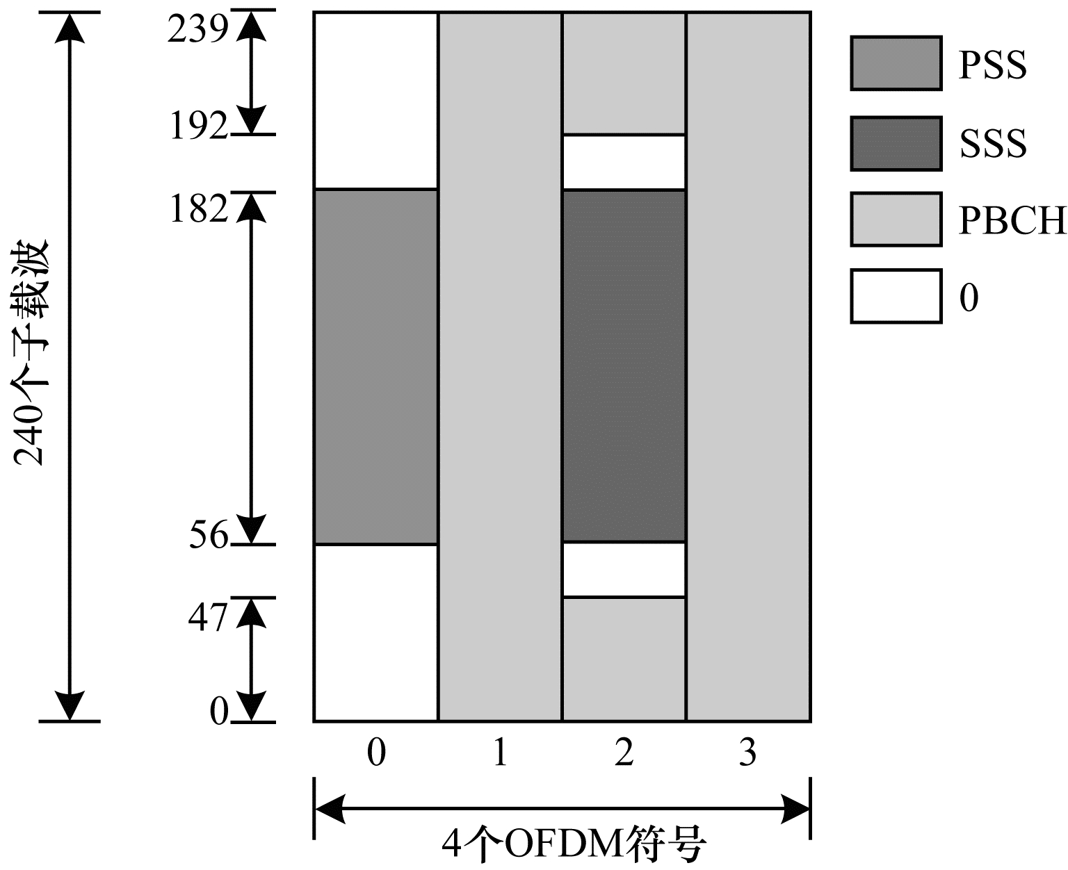 5G系统将辅同步信号(Secondary Synchronization Signal, SSS)、PSS和PBCH联系在一起构成SSB, 该结构有利于快速检测同步信号。SSB可根据5G的不同场景需求在物理层帧结构上进行灵活配置[20]。SSB在时域上由4个连续的正交频分复用(Orthogonal Frequency Division Multiplexing, OFDM)符号组成, 按照升序从0~3进行编号, 在频域上占用240个连续的子载波, 设k为SSB中的子载波索引, 子载波在SSB内按照升序从0~239进行编号。PSS在SSB的第0个OFDM符号上, 频域索引从k=56至k=182, 连续占用SSB中间的127个子载波, PSS两侧分别有56个和57个子载波不发射信号, 用作保护间隔。SSS在SSB的第2个OFDM符号上, 同样占用SSB中间的127个子载波, SSS两侧分别有9个和10个子载波用作保护间隔。PBCH占用SSB中第1个和第3个OFDM符号各240个子载波, 同时还占用SSS所在符号两侧的96个子载波。SSB采用上述时频设计的依据在于, 5G系统中PBCH传输的内容相比LTE系统有一定增加, 2个符号无法携带所有信息, 但再单独占用一个符号会降低频谱利用率, 因此, 可利用同步信号两侧空闲的子载波。由于PSS是终端接入首先检测的信号, 需要通过PSS进行时频偏检测甚至信道估计, 考虑PSS的同步性能, 本文选择将PBCH的部分信息置于SSS的两侧, SSB的时频结构如图 1所示。