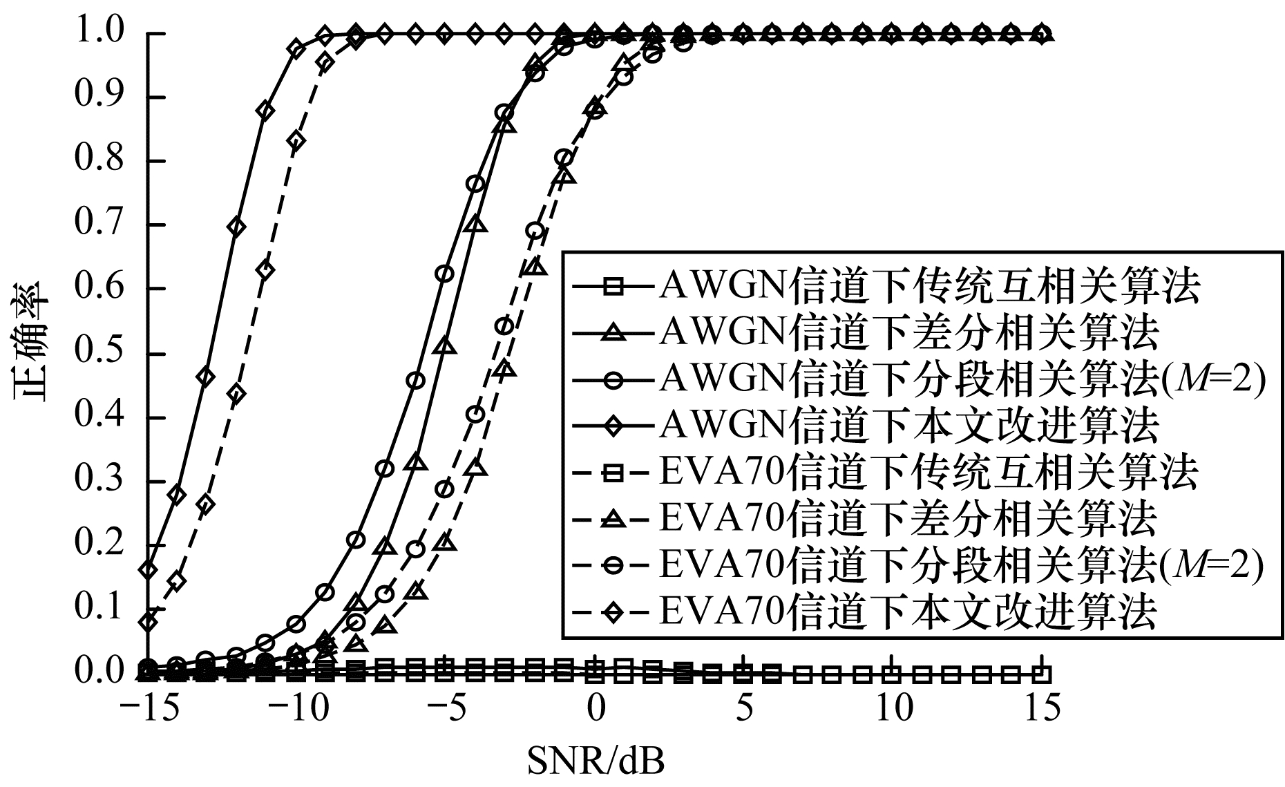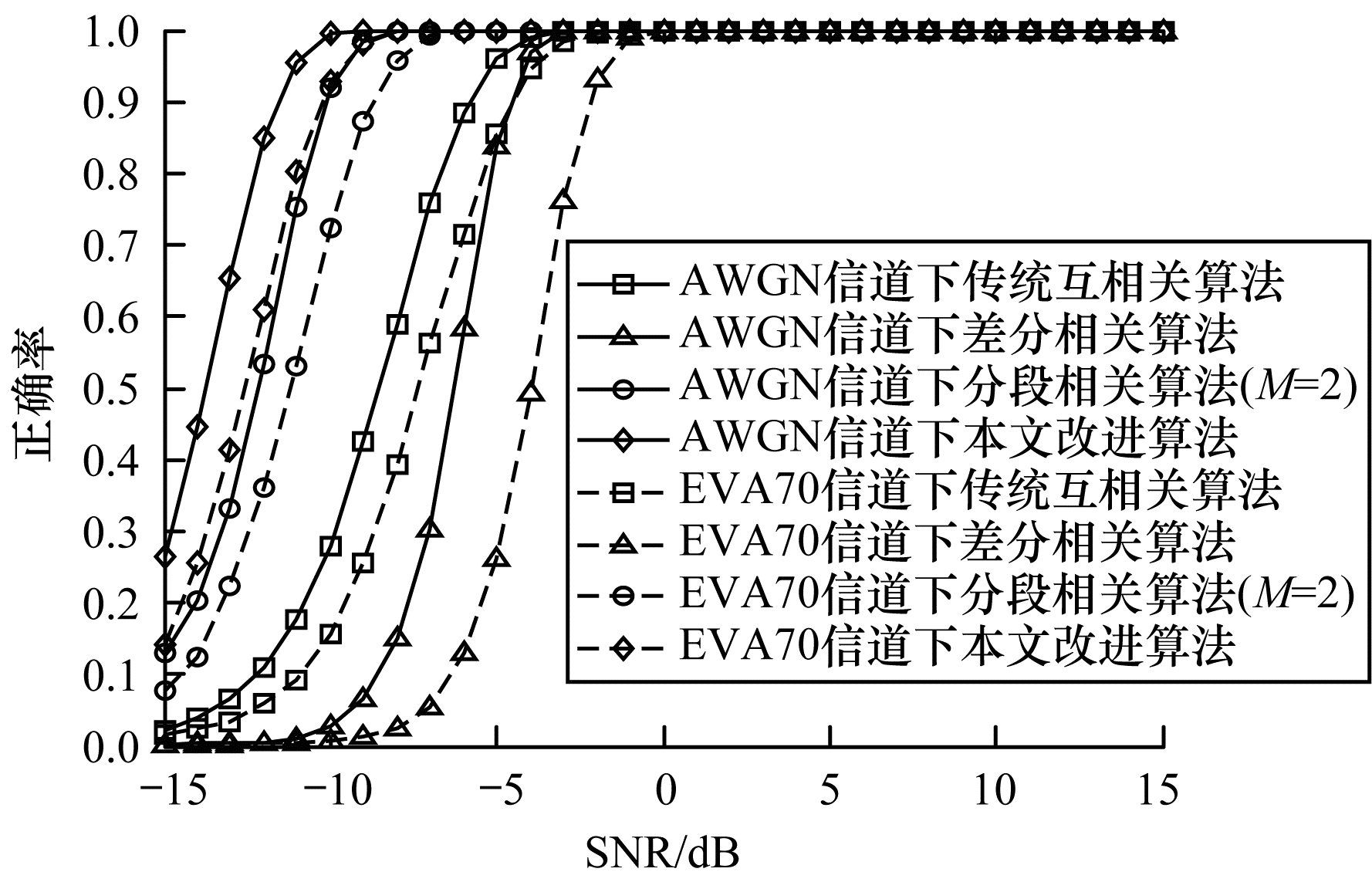 图 10是在AWGN信道和EVA70信道下, 归一化频偏为ε=1.3时定时同步和小区组内ID的联合检测正确率。从图 10可以看出, 当频偏增大到1.3时, 传统互相关算法在AWGN信道和EVA70信道下已经无法正常同步, 差分相关算法虽有一定的抗频偏能力, 但低信噪比时性能极差, 分段相关算法(M=2)检测性能也受频偏影响而出现下降, 但略优于差分相关算法。本文改进算法所受影响不大, 在EVA70信道下当检测概率为90%时, 本文改进算法相比分段相关算法至少有约8 dB的性能提升, 在信噪比为-9 dB时, 本文改进算法在2种信道环境下仍然能保持90%以上的同步正确率。以上结果表明, 本文改进算法在大频偏和低信噪比环境下都具有良好的定时同步性能。