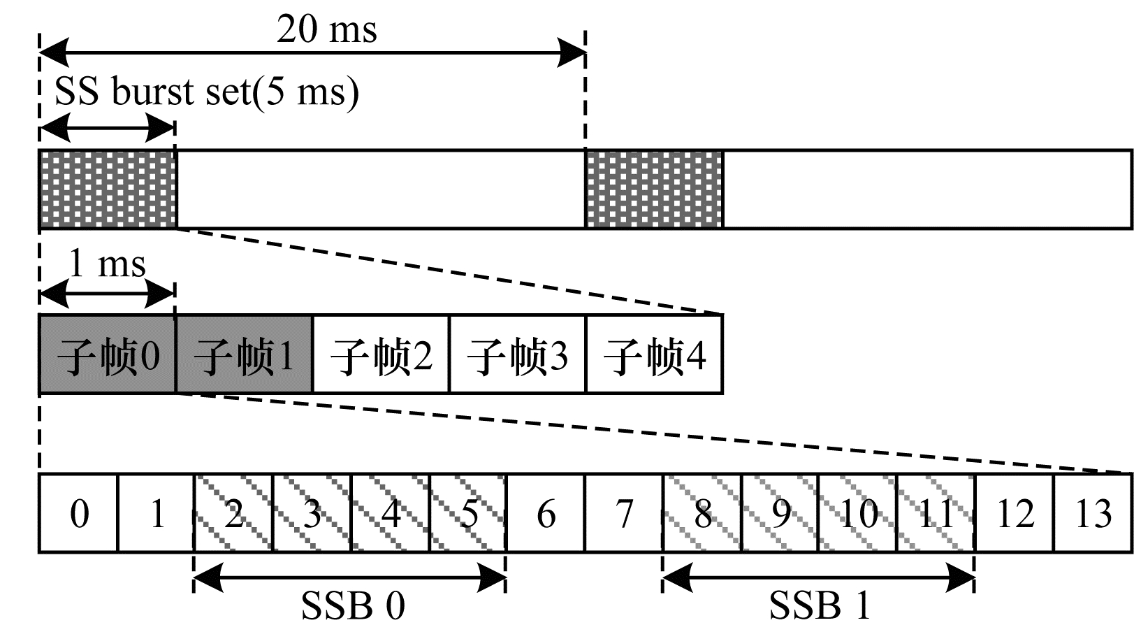 本文重点研究定时同步, 因此, 默认终端已通过频域同步获知子载波间隔。假设u=0, 即子载波间隔为15 kHz, 当载波频率小于或等于3 GHz时, SSB的时域起始符号位置满足{2, 8}+14n, n=0, 1。一个无线帧由10个子帧构成, 在子帧0和子帧1中分别有2个SSB, 其中, 子帧0中SSB起始OFDM符号位置标识为2和8, 同步突发集中的SSB传输相同的PSS序列, 如图 2所示。在图 2中, 网格底纹部分表示一个同步突发集(5 ms), 灰色阴影表示一个子帧, 斜线底纹表示SSB所在的4个OFDM符号, 图中仅画出第0个和第1个SSB的时域映射, 其他参数集u值下SSB的映射方式类似, 此处不再赘述。
