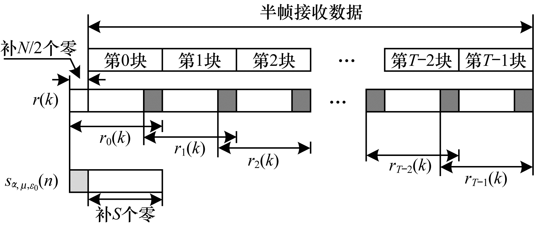 首先将接收数据r(k)按照固定长度分为T块, 每个分块的长为S, 当最后分块长度不足S时, 在其后补零至S长度。为了不发生信号遗漏, 对每相邻的2块数据进行重叠保留处理, 即相邻2块数据有N/2点的重叠, 在第0块接收数据前补N/2个零, 具体的重叠保留分块操作如图 4所示。