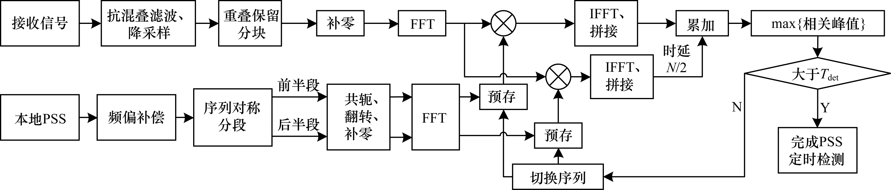 联合式(16)、式(17), 可将原长相关窗中的本地PSS序列分为前后2段, 并分别与接收信号滑动相关, 2次相关的结果再时延N/2后累加, 如下: