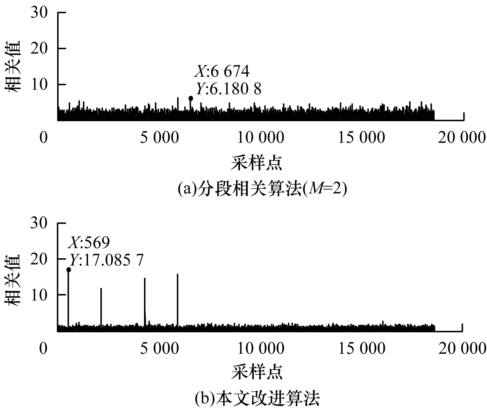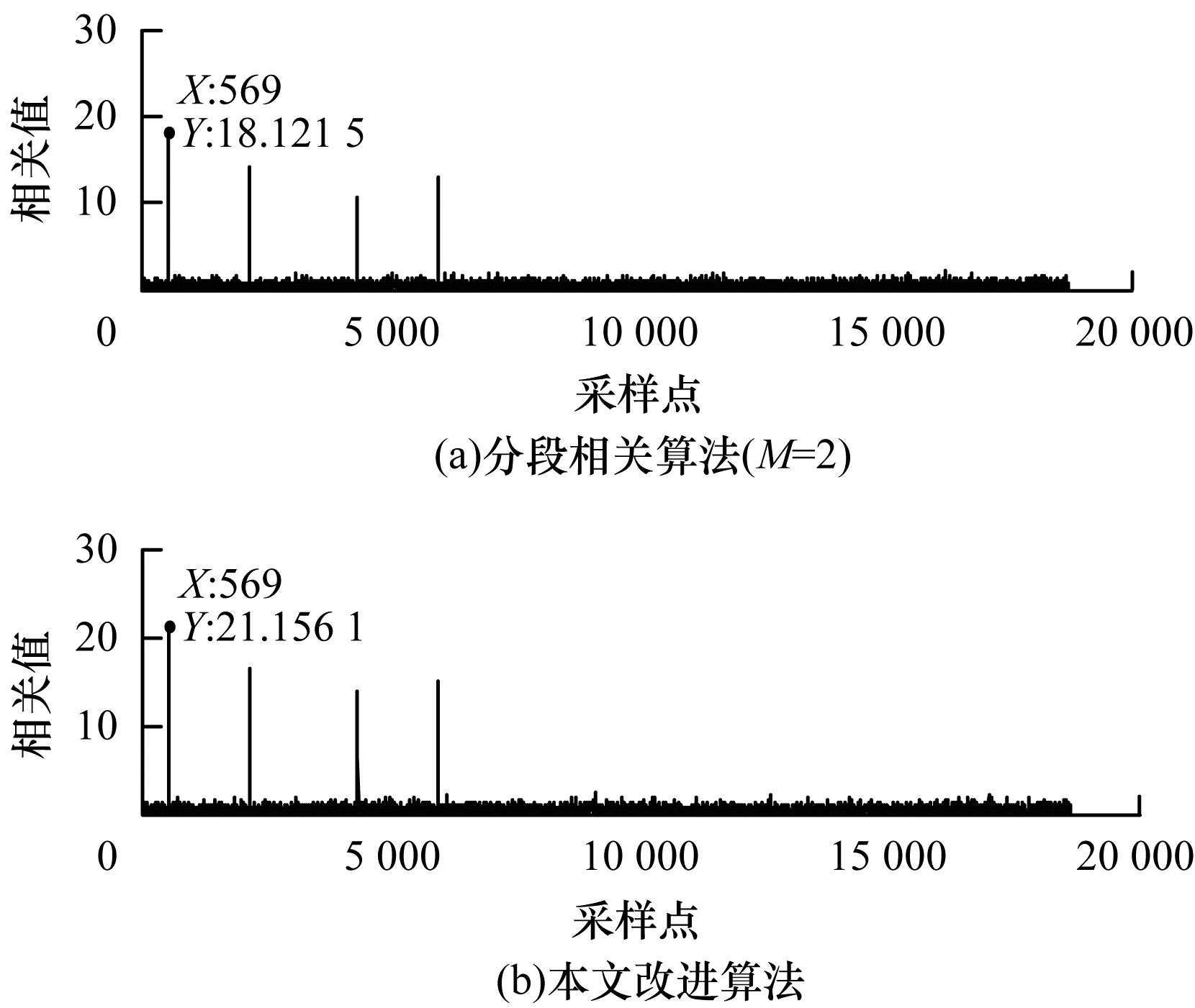 | 图 6 ε=0.6时2种算法的相关峰值 Fig. 6 Correlation peak values of two algorithms when ε=0.6 | |