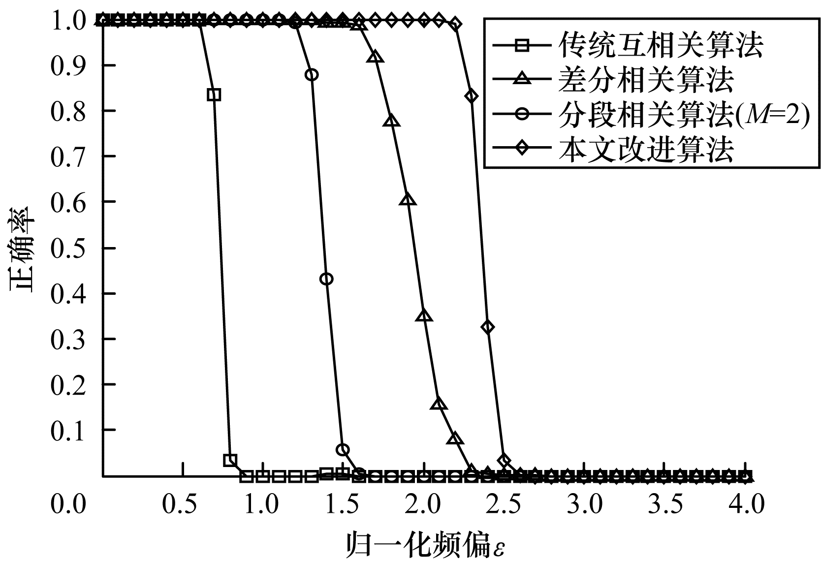 传统互相关算法原理简单, 但是逐点滑动相关导致其运算量较高, 且该算法未采用抗频偏处理, 在有频偏的环境下同步性能会大幅降低。
