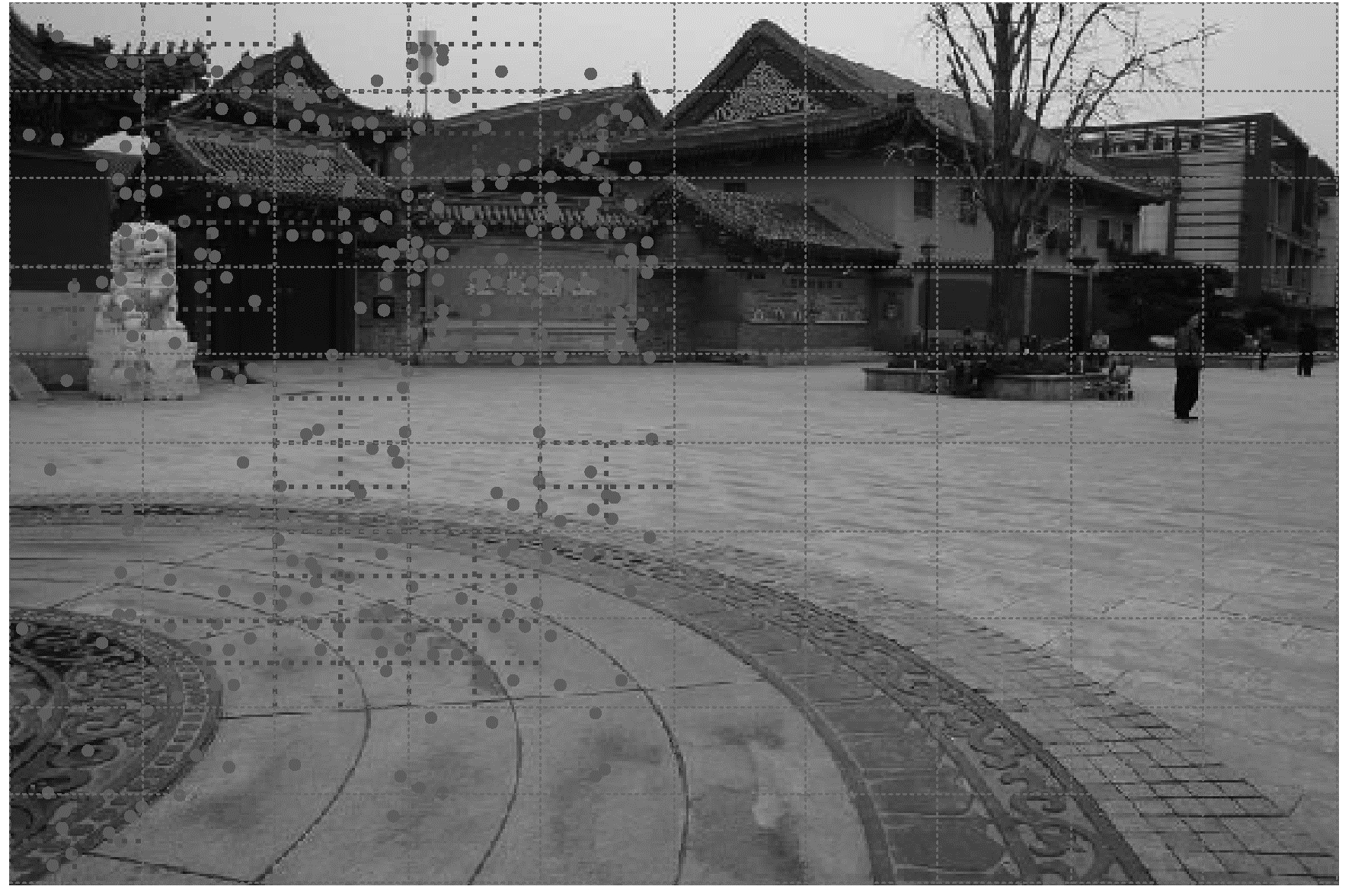 本文使用SIFT算法[12]生成成对特征点, 根据SIFT算法的原理可知, 特征点数量分布与图像纹理的复杂度相关。若将图像分为C1×C2个网格, 利用Moving DLT算法计算每个网格的单应矩阵Hn, 1, n∈{1, 2, …, C1×C2}。但是, 网格的密度过于稀疏, 对于目标图像纹理复杂的重叠区域, 很容易出现重影现象。