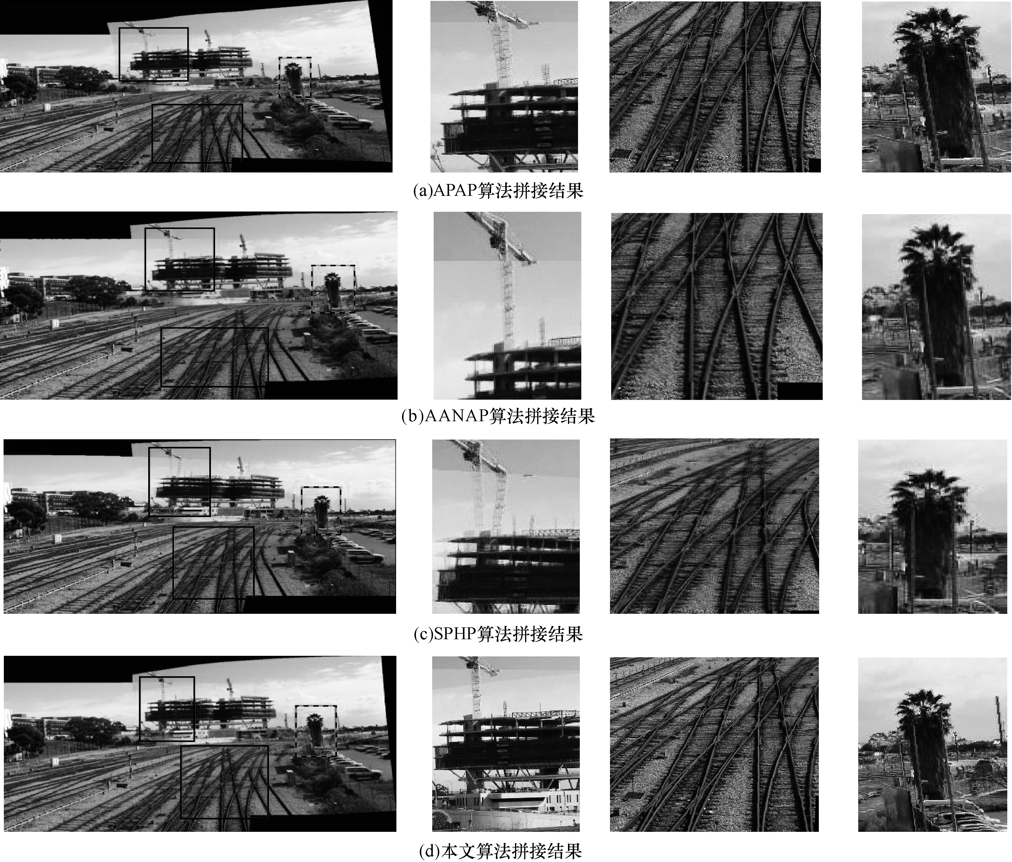 4.2 视觉主观评价图 3所示为APAP、AANAP、SPHP的拼接结果和本文算法在文献[4]数据集中的Rail Tracks图像上的拼接结果。其中, 实线区域为拼接图像重叠区域的误差, 虚线区域为非重叠区域发生的透视失真范围。在图 3(a)中, APAP算法使用局部网格来调整图像, 重叠区域配准效果较理想, 但非重叠区域没有透视失真校正, 发生了严重畸变, 其中, 树木发生了严重的倾斜, 与真实图像差别较大。在图 3(b)中, AANAP算法先使用APAP算法进行局部配准, 再调整部分非重叠区域, 最后调整全局拼接图像。该算法对重叠区域配准效果良好, 但非重叠区域会发生透视失真, 且会造成拼接接口位差, 如图 3(b)中的树木和塔吊拼接线位置。SPHP算法更注重非重叠区域透视变换和减少失真, 但重叠区域拼接精度却很差, 如图 3(c)中非重叠区域没有发生明显形变, 但重叠区域出现了严重重影。图 3(d)为本文算法拼接结果, 该算法根据匹配点的分布对网格细分, 寻找目标变换图像的全局最优相似变换, 将全局最优相似变换矩阵和网格单应矩阵加权叠加, 不仅可以精密调整重叠区域, 而且使得非重叠区域透视失真最小, 最后再对重叠区域的内容进行感知, 保留重要度较低的区域并融合拼接, 使拼接效果更能还原真实场景。
