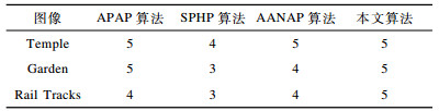 使用国际无线电咨询委员会制订的CCIR500-1图像拼接效果主观评价标准[19], 对APAP算法、SPHP算法、AANAP算法和本文算法的拼接效果进行比较, 结果如表 1所示。从表 1可以看出, 本文算法得到的拼接图像均为5级, 拼接效果最好。