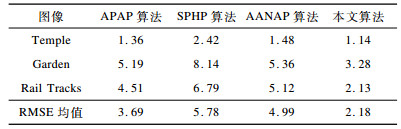 4 实验结果与分析本文以Matlab R2014a作为实验平台, 使用文献[4]数据集中的3组图像, 名称(大小)分别为:Rail Tracks(600×800×3), Temple(487×730×3), Garden(1 000×750×3)。使用上述3组图像分别对APAP算法、SPHP算法、AANAP算法和本文算法作对比实验, 主要从视觉主观[18]、量化对齐和拼接速度等方面验证算法的性能优劣。