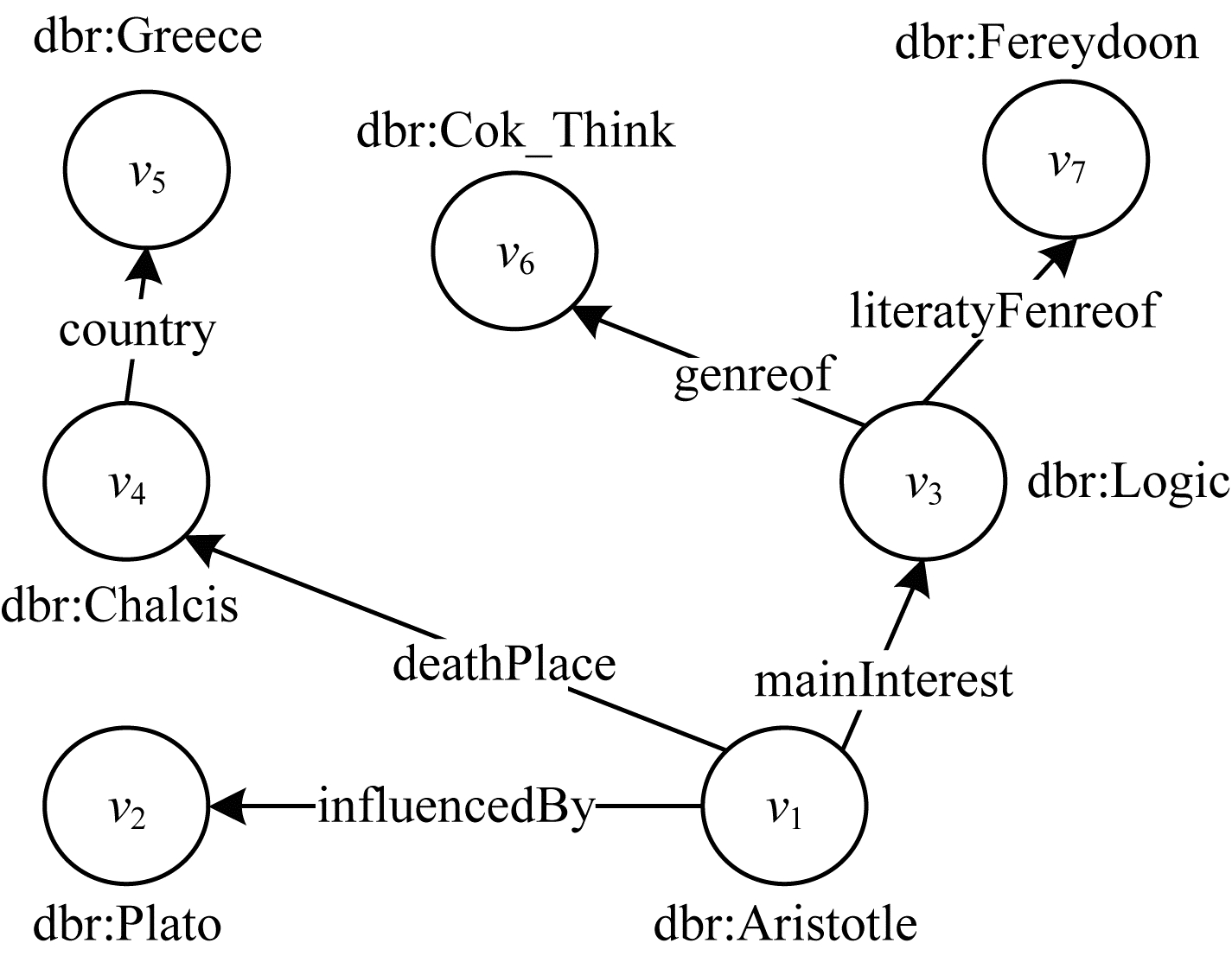 有向标签图在一般图模型的基础上为每个顶点添加了标签, 是RDF图的一种特殊形式, 其形式化定义[3]如下: