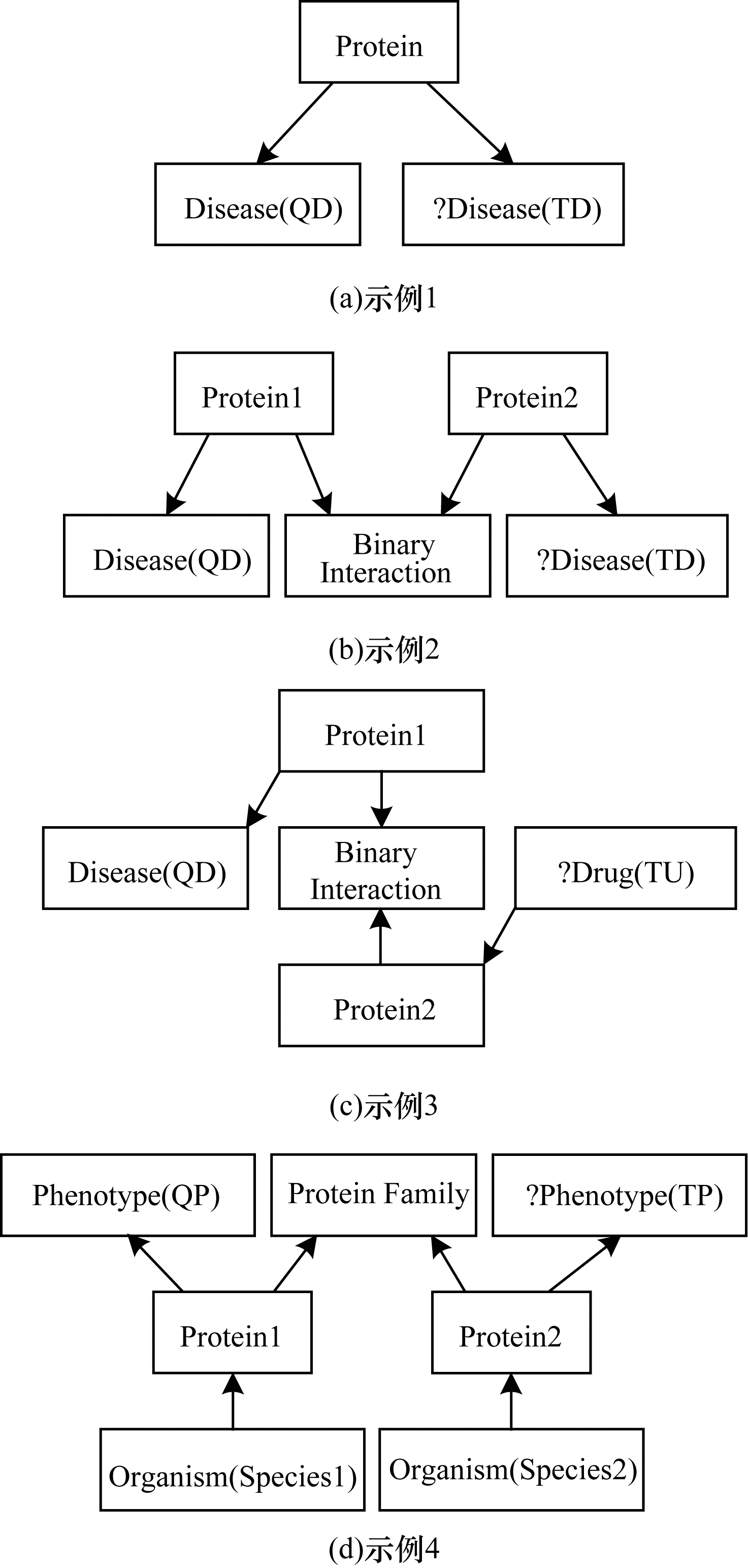 文献[40]提出一种在生物信息应用中使用基于模板的可视化查询框架。如图 10所示, 其通过矩形和有向线段的组合表示查询模式, 其中, QD代表已知的实体, TD表示期望查询到的结果。图 10(a)表示查询与已知疾病有共同蛋白质关联的疾病, 图 10(b)表示查询与已知疾病关联蛋白质有二元相互作用的蛋白质关联的疾病, 图 10(c)将图 10(b)查询变量换为病毒, 图 10(d)表示查询的一个生物的表型关联的蛋白质与已知生物的表型关联的蛋白质属于同一个蛋白质家族, 但不是一类蛋白质。