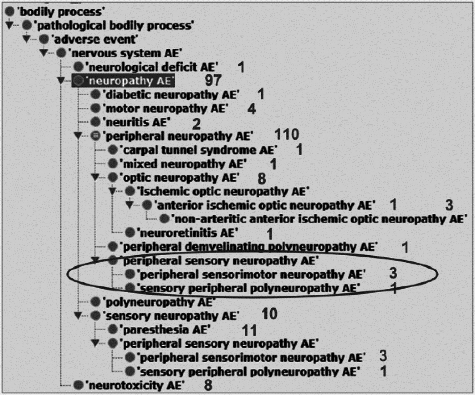 2.3.1 基于层次结构的可视化查询目前, 大量的本体可视化查询方法通常侧重于本体的层次结构, 文献[44]提出了Protégé, 一款基于Java语言开发的本体编辑和知识获取软件, 主要针对本体的层次结构进行可视化, 并为多重继承复制概念, 如图 11所示, 其中非层次结构在单独的窗口中以文本形式列出。该软件目前被广泛应用于生物医学领域。树视图和欧拉图是体现层次结构最佳的可视化模型, 缩进列表作为树的一种特殊形式, 能够清晰地体现本体的类名以及层次关系, 但是无法表达处于同一层次关系的本体间的关系。另一方面, 尽管欧拉图能够通过节点嵌套的形式体现本体的层次关系, 以及通过节点的大小和节点间的距离体现实体间的关系, 如以距离体现实体间的相似度, 但是和树视图一样无法体现多层继承关系, 并且不适合大规模的本体数据。