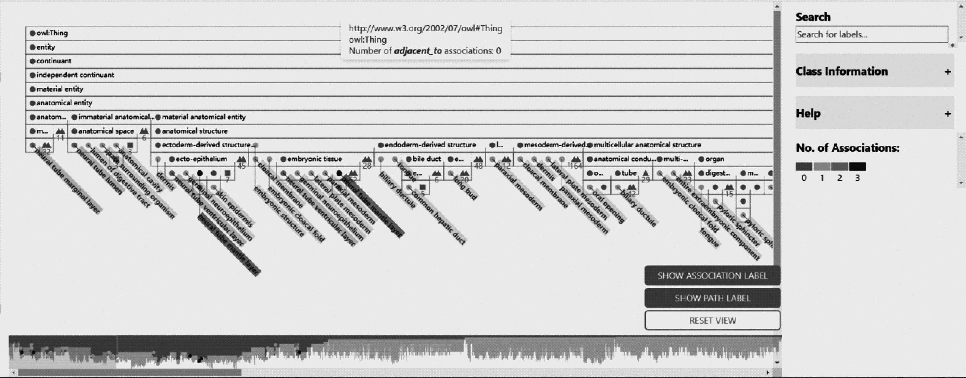 本体中不仅包含丰富的层次关系信息, 而且包含大量的类、属性及实体间的复杂关联信息。针对层次结构无法有效表达此类信息的问题, 文献[10]提出了一种大型本体非层次关联可视化查询系统OntoPlot。如图 12所示, OntoPlot采用冰柱图[45]作为主要的可视化方法, 能够有效地保留本体的主要层次结构, 同时对查询结果中涉及不到的节点进行视觉压缩, 从而使得查询结果能够基本处于同一层次高度, 实现大规模本体数据上的非层次关联查询。