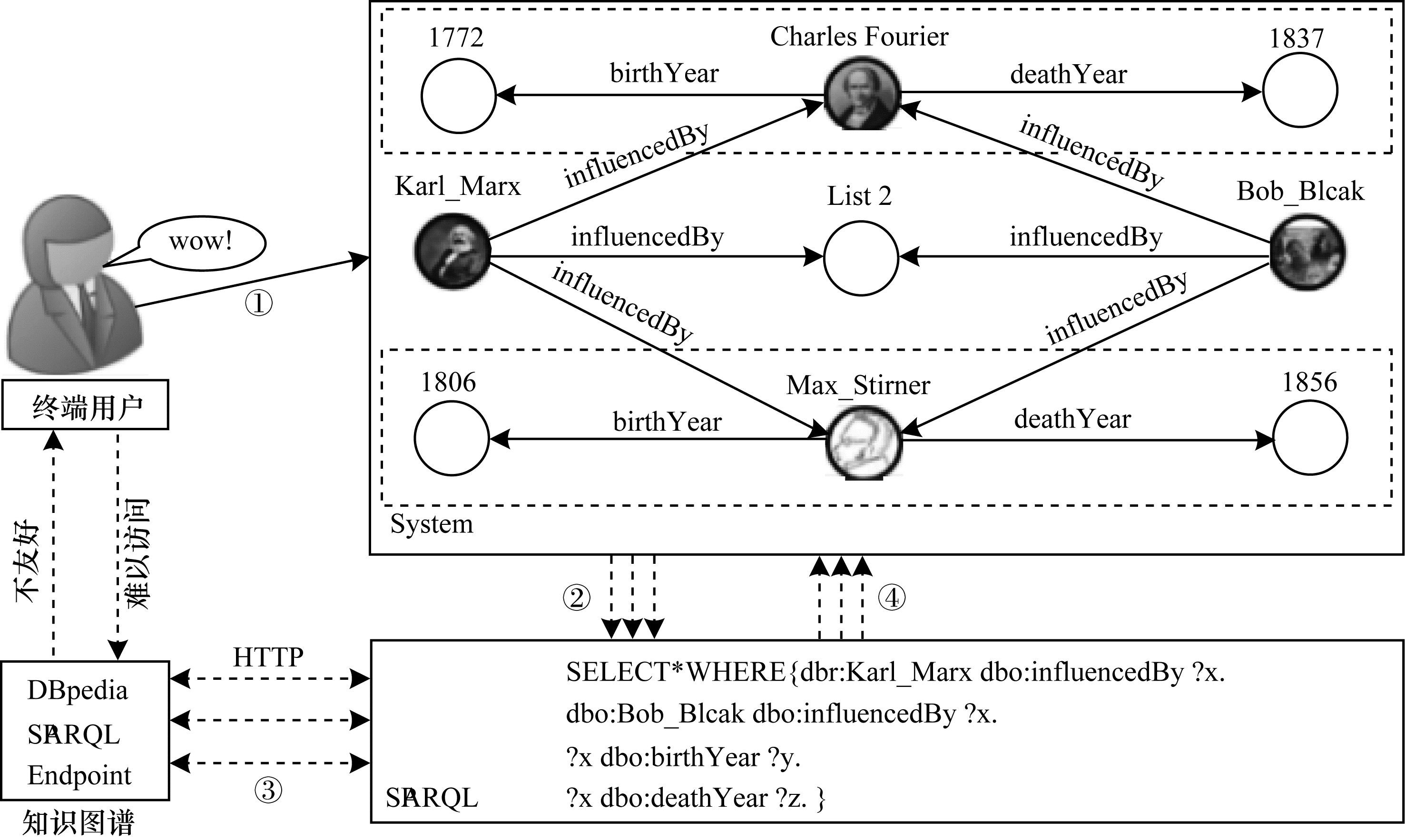 目前, 多数可视化查询语言的查询模式与查询结果之间存在壁垒, 当查询结果不符合用户的查询意图时, 用户往往不知如何修改查询模式。文献[33]提出了知识图谱上的交互式可视化查询语言KGVis, 通过将中间结果存储在查询模式中, 实现了查询模式与查询结果间的双向转换, 从而打破了两者间的壁垒。KGVis支持在构造查询模式的过程中进行实时数据查询, 使用户可以通过查看中间结果来确保查询模式的正确性。图 6展示了基于KGVis的可视化查询系统架构, 用户通过可视化界面构造查询模式, 系统后台自动生成相应的查询语句, 通过HTTP请求相应的知识图谱Endpoint, 并将结果可视化展现给用户。