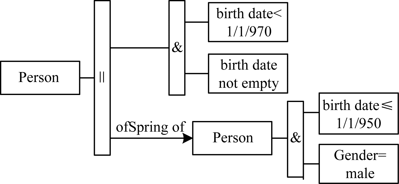 在针对属性图的图模式匹配方面, 文献[34]提出了属性图上的可视化查询语言V1, 值得注意的是, V1并不与某一种特定的属性图查询语言进行绑定, 如图 7所示, 其通过矩形和线段的组合来表示属性图上的基本图模式, 利用不同的颜色区分节点的类别。由于不基于任意一种图查询语言, 因此V1的语法中不包含“AND”等运算符, 而是采用算术与逻辑运算符“&”“‖”“×”等。文献[34]以奇幻小说《冰与火之歌》为知识背景详细地介绍了V1丰富的表达能力, 由于笔者还未了解到有基于V1的可视化查询系统, 因此目前其对于用户的可学习性和可读性仍未知。文献[35]对属性图上的查询语言进行了性能测试, 包括Cypher、Gremlin等。