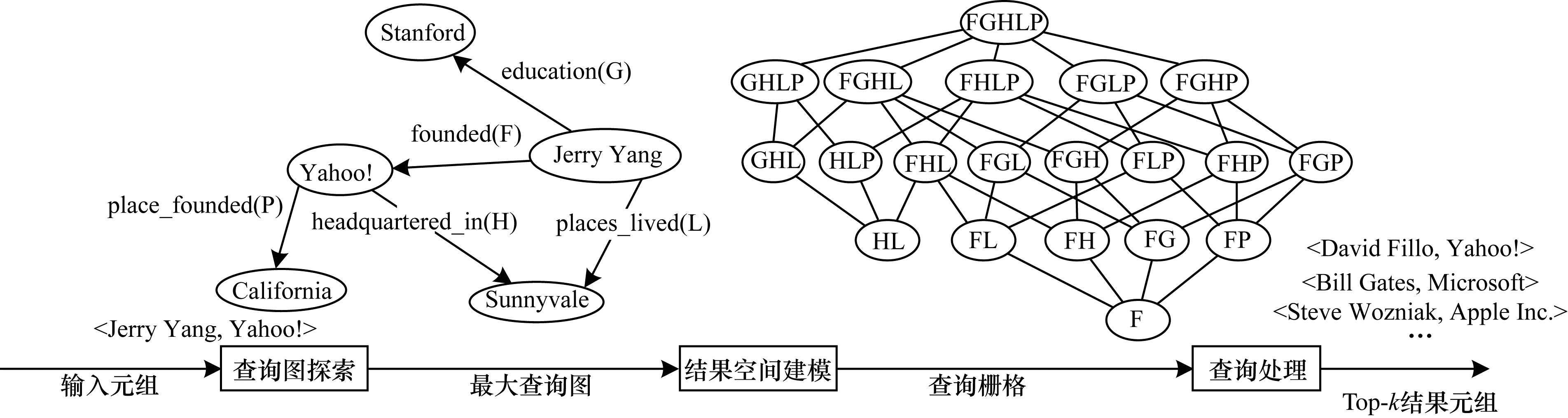 2.2.1 基于关键字的可视化查询系统基于关键字的查询是搜索引擎中最常用的方法, 用户只需要输入一个或多个关键字, 系统就能根据用户输入的关键字进行检索并返回相近的查询结果。文献[36]基于关键字查询方法提出了知识图谱上基于实体元组的查询系统GQBE, 图 8展示了其查询架构。系统以用户输入的实体元组作为关键字, 计算实体元组构成的加权隐藏最大子图, 通过计算查询结果与关键字的相似度对查询结果进行排序, 返回相似度较高的查询结果。该系统虽然简化了用户的输入以及对知识图谱背景知识的需求, 但只能进行简单的元组模式查询, 无法进行复杂的图模式查询。另一方面, 用户只能输入实体作为查询的关键字, 实体与实体间的关系需要通过算法进行计算。由于实体与实体间往往存在不止一种关系, 因此基于关键字的可视化查询系统使用并不广泛。