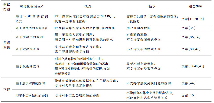 5 结束语知识图谱可视化查询是通过图形图像描述知识资源及它们之间的相互联系, 并在此基础上提供查询服务的一项计算机技术。本文以“知识图谱数据模型-可视化技术-知识图谱可视化查询语言-知识图谱可视化查询方法-领域知识图谱可视化查询应用”为主线, 对比分析2种知识图谱可视化查询语言和5种知识图谱可视化查询方法的优缺点, 对目前知识图谱上的可视化查询技术进行研究。随着知识图谱在新一代人工智能发展中发挥愈加关键的作用,大规模、跨领域知识图谱的可视化查询方法与技术将会有更广泛的需求与应用。因此,基于统一模型的知识图谱可视化查询语言、感知语义的知识图谱可视化技术、面向领域知识图谱优化的可视查询方法以及大规模知识图谱的高效可视化查询策略,将是未来知识图谱可视化查询重要的发展方向。