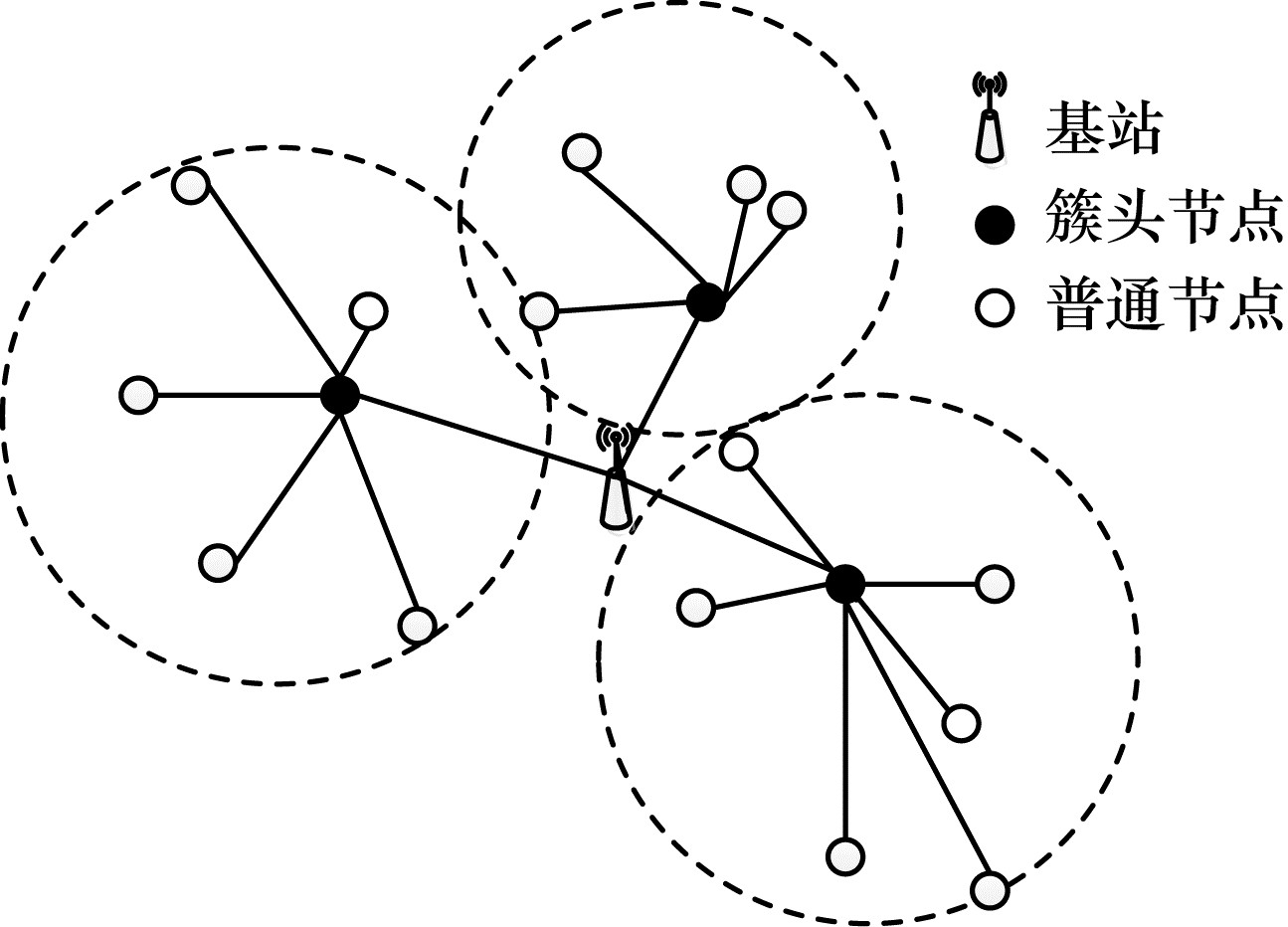 1 网络模型在无线传感网中, n个节点构成m个簇结构。簇头收集簇内节点传输的数据, Sink节点融合数据, 以保证全局最优[9]。1)传感器节点同构且位置固定, 感知半径、通信能力和初始能量相等, 每个节点具有唯一ID, 且周期性地向簇头传输数据; 2)节点非均匀分布, 簇头能感知簇内节点的位置与剩余能量, 簇内节点能感知自身剩余能量; 3)不论剩余能量是否有限, 能耗控制均需在节点承受的能量范围内; 4)节点自感知且主动收集数据, Sink节点没有能量限制。网络模型[10]如图 1所示。