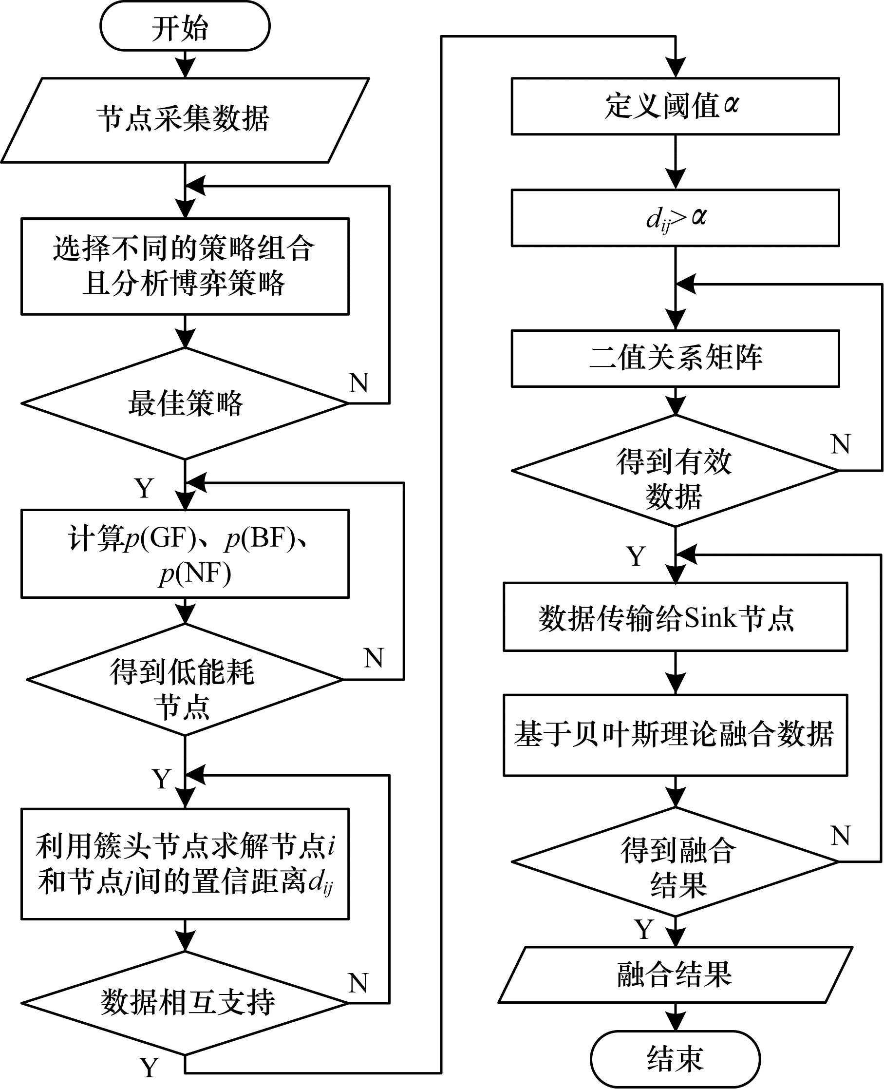 2.2 基于贝叶斯理论的数据融合通过博弈论选取低能耗节点的方式不能保证采集数据均可靠, 因此簇头需通过置信距离筛选可靠数据, 提高精确度。置信距离[12]基于预判测量数据与实际数值的紧密程度, 确保采集数据接近实际结果。令xi、xj为一次测量中第i个和第j个节点的输出, 且i < j表示节点顺序, 置信距离定义如下: