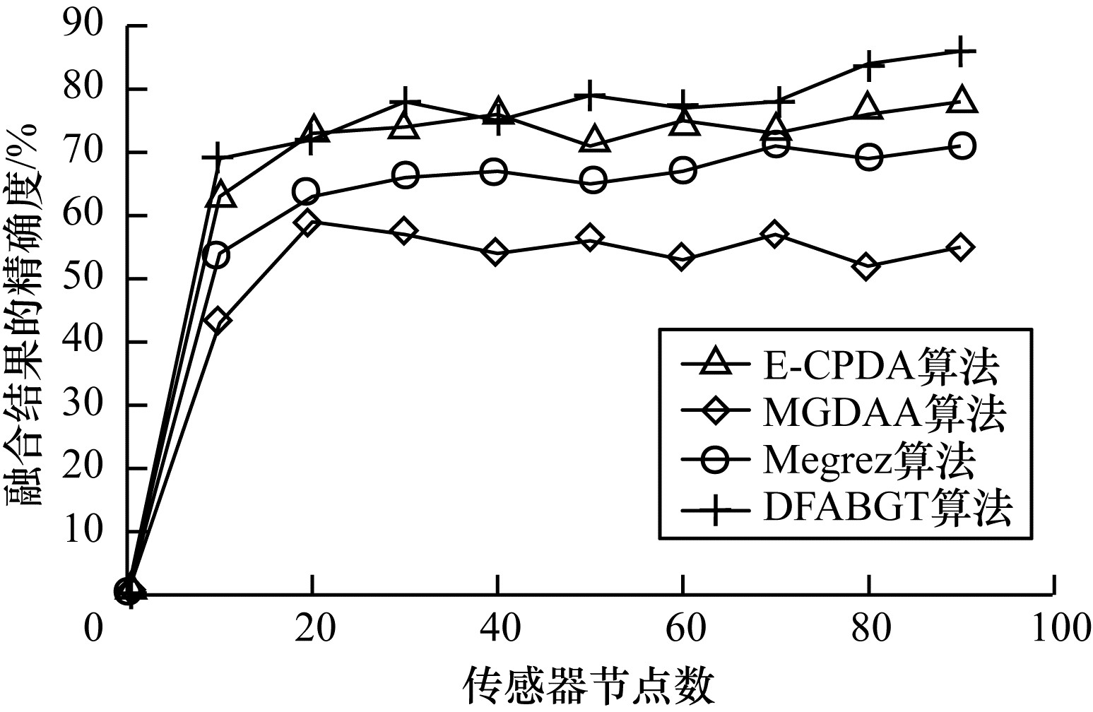 由图 3可知, DFABGT算法、E-CPDA算法、MGDAA算法与Megrez算法的融合精确度随着节点数的增多均呈上升趋势。在传感器节点数为10~90时, DFABGT算法相比E-CPDA算法、MGDAA算法与Megrez算法精确度上升均值为3.9 %、21.2 %和12.1 %。E-CPDA算法通过降低节点在通信过程中的碰撞几率提高精确度, 但其未筛选数据; MGDAA算法通过改变簇结构冗余度和结构变化度从而破坏原始数据; Megrez算法中的压缩和重构过程破坏了原始数据; DFABGT算法在筛选原始数据时并没有破坏和构造数据, 因此其精确度高于其他算法。
