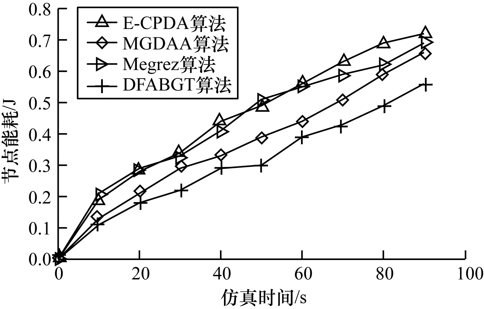 由图 4可知, DFABGT算法与E-CPDA算法、MGDAA算法和Megrez算法比较, 节点能耗分别降低28 %、22 %和19 %。E-CPDA算法通过减少通信传输量降低能耗, 导致存在额外簇结构的能耗; MGDAA算法与Megrez算法以节点能耗为代价换取数据精确度, 但却未兼顾节点能耗问题, 而DFABGT算法通过融合能耗进行博弈来降低节点能耗, 且未产生额外能耗。综上, DFABGT算法的能耗低于其他算法。