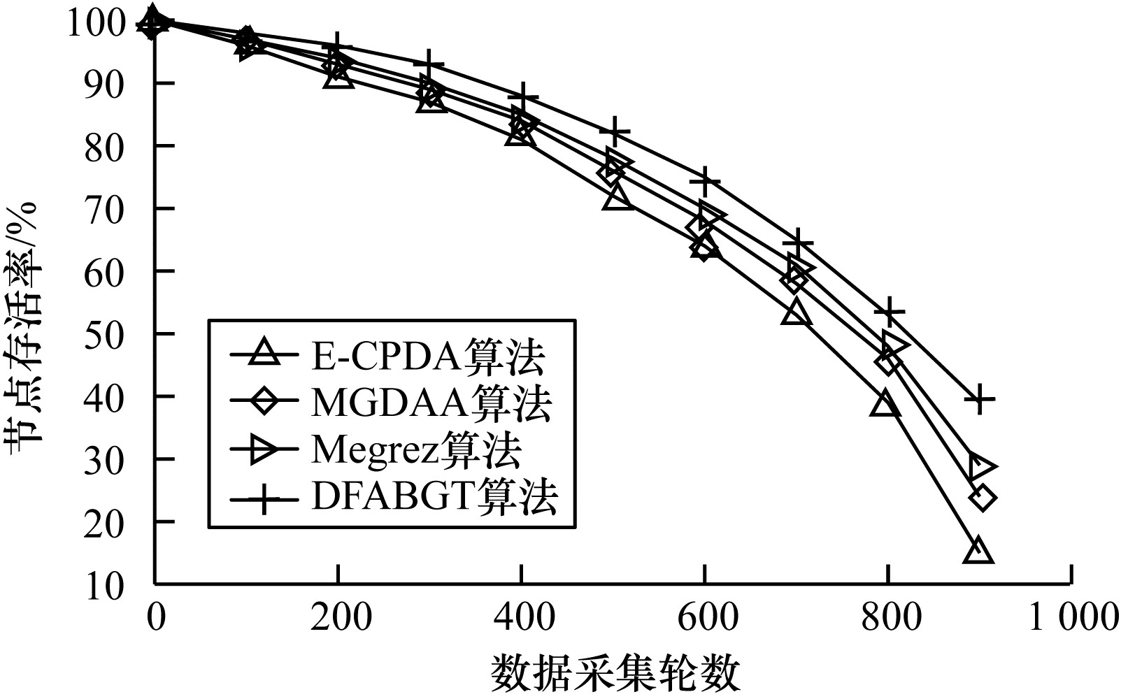 由图 5可知, DFABGT算法与E-CPDA算法、MGDAA算法和Megrez算法进行比较, 网络生命周期分别延长5 %、3.1 %和4.8 %。E-CPDA算法、MGDAA算法和Megrez算法未筛选节点与数据, 因此增加了能耗, 且E-CPDA算法增加了簇结构的能耗, 而DFBAGT算法通过选取节点、筛选数据, 大幅度降低节点能量的消耗, 使得节点存活率下降幅度低于其他算法。综上, DFABGT算法的网络生命周期更长。