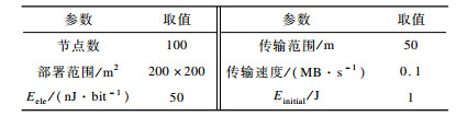 其中, ETx(l, d)为发送端经过距离d发送l bit数据的能耗, ERx_elec(l)为接收端接收l bit数据的能耗, d0=25 m为阈值, Eelec为节点收发每比特数据的能耗, εfsd2与εmpd为4信号自由空间模型和多径衰减模型中信号放大器的能耗参数[18]。当发送端与接收端的距离小于阈值时, 采用自由空间的通信方式, 发送端能耗与距离的平方成正比; 否则采用多径衰减的通信方式, 发送端能耗与距离的4次方成正比。