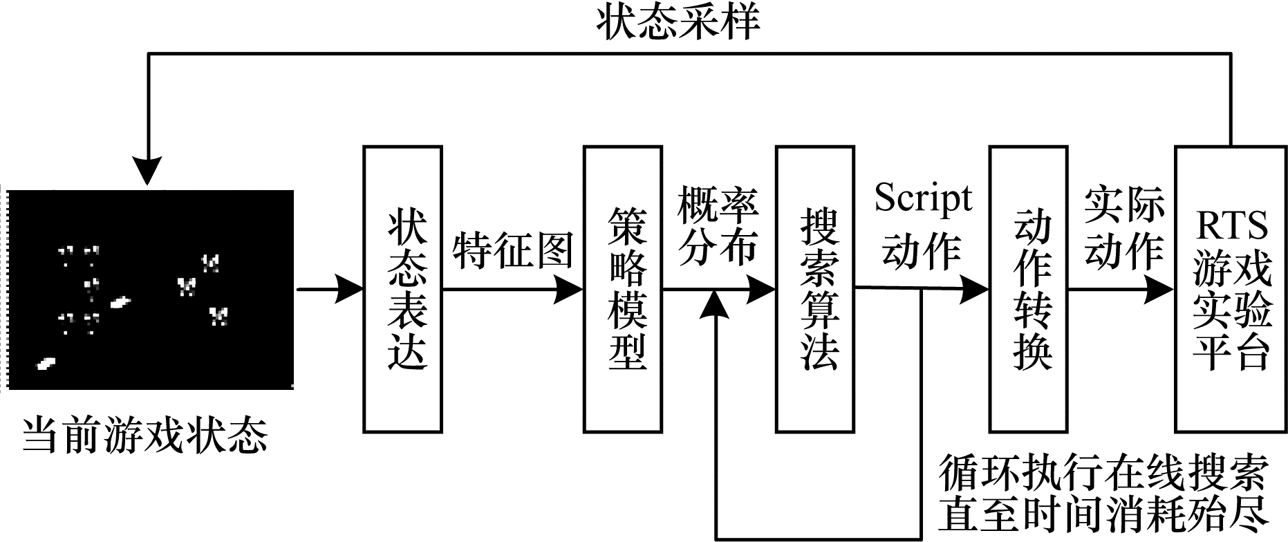| 图 1 融合深度学习与搜索的RTS游戏微操方法 Fig. 1 Micromanipulation method of RTS game combining deep learning and search | |
