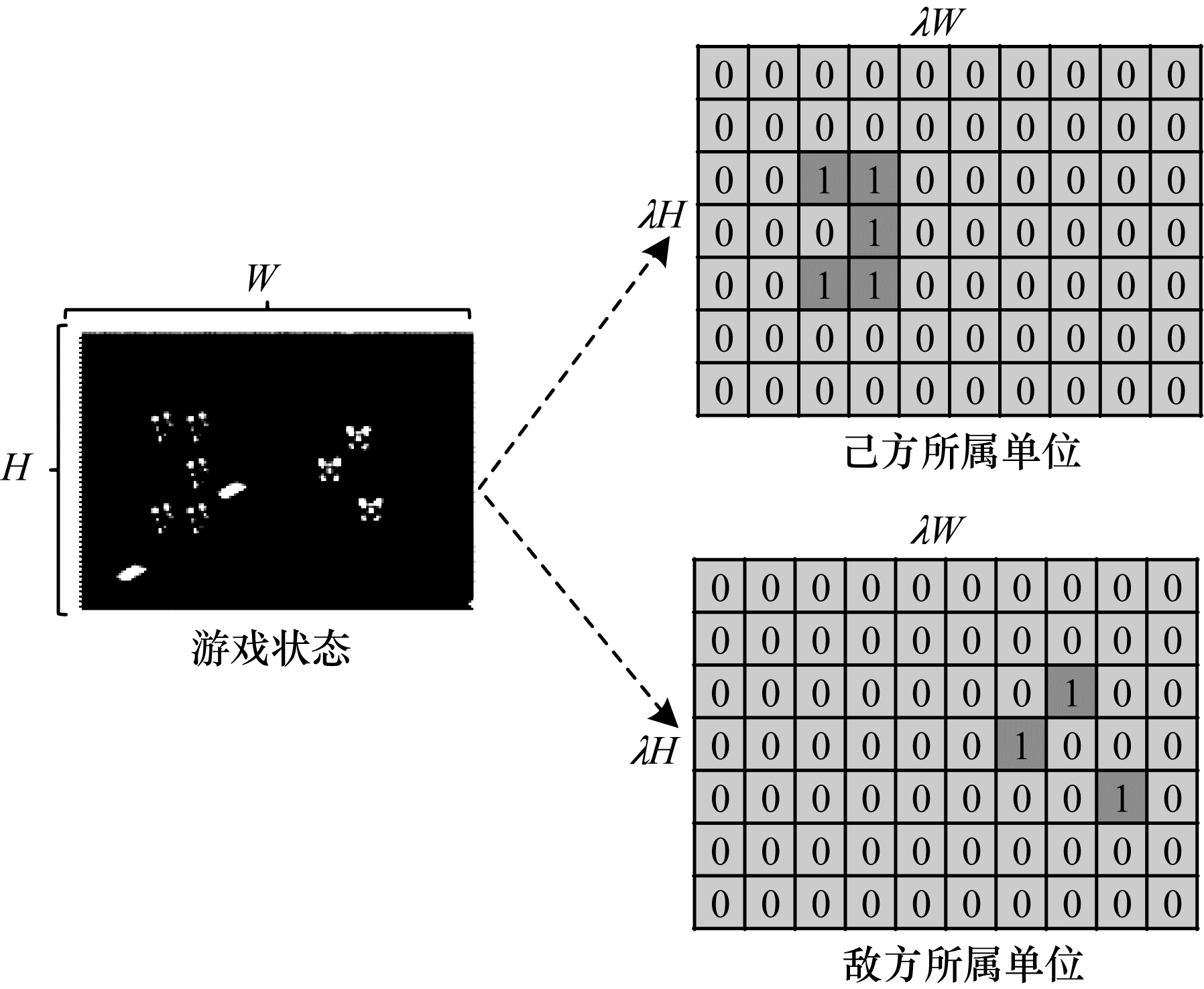 特征编码采取one-hot编码方式, 每一种连续或离散特征对应多通道的0/1特征图, 共编码为56通道特征图。如图 2所示, 单元所属被编码为2通道特征图, 分别对应己方所属、敌方所属。考虑到实际游戏状态的稀疏性, 作战单元仅占据很小的空间, 特征编码在变化的作战场景尺度上进行。具体地, 若作战场景尺度为H×W, 则特征图尺度为λH×λW, λ≤1为缩放系数, 单元在作战场景中的真实坐标可以映射为特征图的像素坐标。