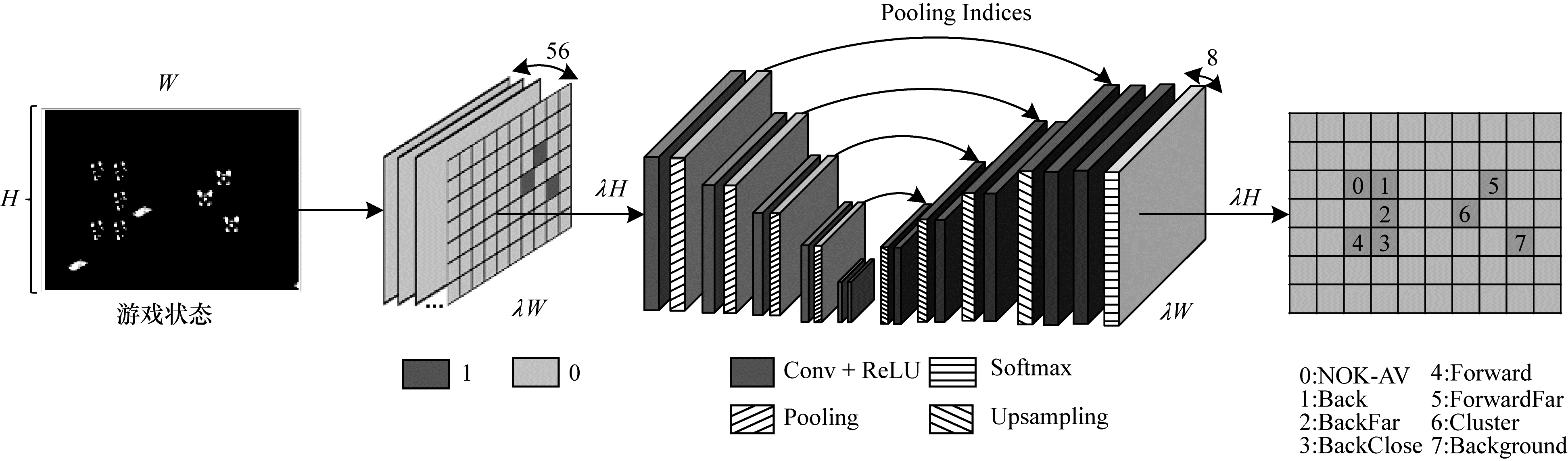 3.4.1 网络结构考虑到编码-解码卷积架构在图像分割[27]领域的成功, 本文提出面向RTS游戏微操的联合策略网络。JPN的结构设计参考SegNet, 如图 3所示, 主要不同点是移除了大量卷积层, 以保证前向运算的速度。具体地, JPN的编码部分包含5层卷积层、4层最大池化层, 解码部分包含5层卷积层、4层上采样层, 最后一层接Softmax层。其中, 10层卷积层的卷积核大小都为3×3, 第1层、第10层卷积层的卷积核数量为64, 第2层、第9层卷积层的卷积核数量为128, 第3层、第8层卷积层的卷积核数量为256, 其余卷积层的卷积核数量都为512;4层最大池化层与4层上采样层一一对应, 采样步长都为2, 两部分分别实现输入特征图的16倍尺度缩小、放大, 使得输入、输出的尺度均为λH×λW。