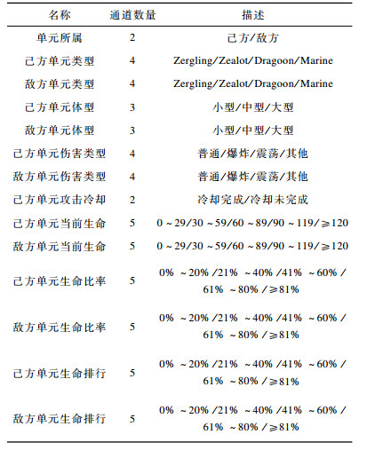 状态表达是将原始游戏状态转换为多通道特征图。鉴于RTS游戏涉及单元种类繁多, 本文参考之前搜索方法和多智能体强化学习方法的设置, 选取StarCarft中4种采用物理攻击的作战单元, 分别是Zergling、Zealot、Dragoon、Marine。在状态特征设计上, 主要考虑与空间分布、伤害机制密切相关的单元属性, 具体如表 1所示, 己方、敌方各对应一半。其中, 不同单元之间可造成的伤害由单元类型、攻击类型、体型共同决定, 单元生命按基数、比率、序数划分为3种特征, 基数、序数分别对应当前生命、生命排行, 比率表示当前生命与最大生命的比值。