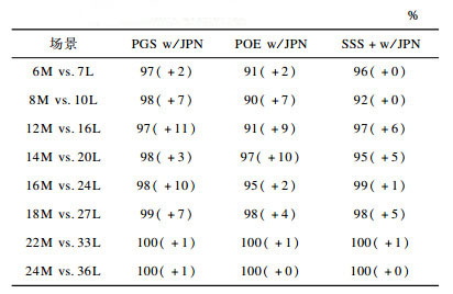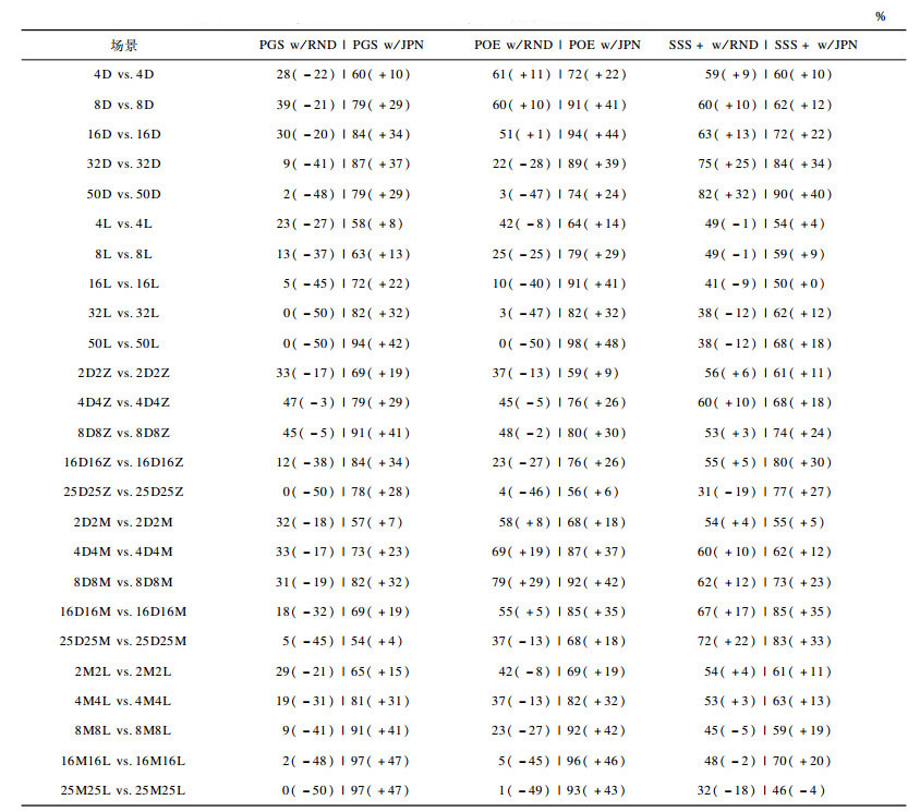 改进方法(PGS w/JPN、POE w/JPN、SSS+w/JPN)、结合随机先验概率分布的搜索方法(PGS w/RND、POE w/RND、SSS+ w/RND)对抗原始方法(PGS、POE、SSS+)的实验结果如表 3所示, 其中, 第1列指定了场景设置, 第1行指定了测试的搜索方法。例如在场景4D4Z vs.4D4Z中, PGS w/RND vs.PGS的胜率是47%, PGS w/JPN vs.PGS的胜率是79%, 对应地, 两种搜索方法的增益分别是-3%和+29%。