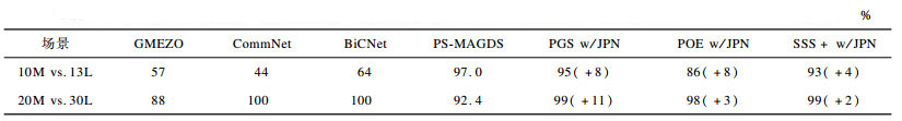 4.2 基准算法设置采用PGS[16]、POE[17]、SSS+[18]作为基准搜索方法, 采用GMEZO[21]、CommNet[25]、BiCNet[22]以及PS-MAGDS[26]作为基准多智能体强化学习方法。为评估改进方法的性能提升, 实验对比了原始方法(PGS[16]、POE[17]、SSS+[18])、改进方法(PGS w/JPN、POE w/JPN、SSS+ w/JPN), 以及结合随机先验概率分布的搜索方法(PGS w/RND、POE w/RND、SSS+ w/RND)。出于公平性, 借鉴SSS+[18]中可能动作集合的大小, 三类搜索方法可能动作集合的大小均设置为3, 原始搜索方法默认为NOK-AV、Kiter、Cluster, 其他搜索方法依据各自的先验概率分布, 从7种Script动作中构建各自的可能动作集合。除此以外, 所有搜索方法的参数一致, 如决策时间限制为40 ms。