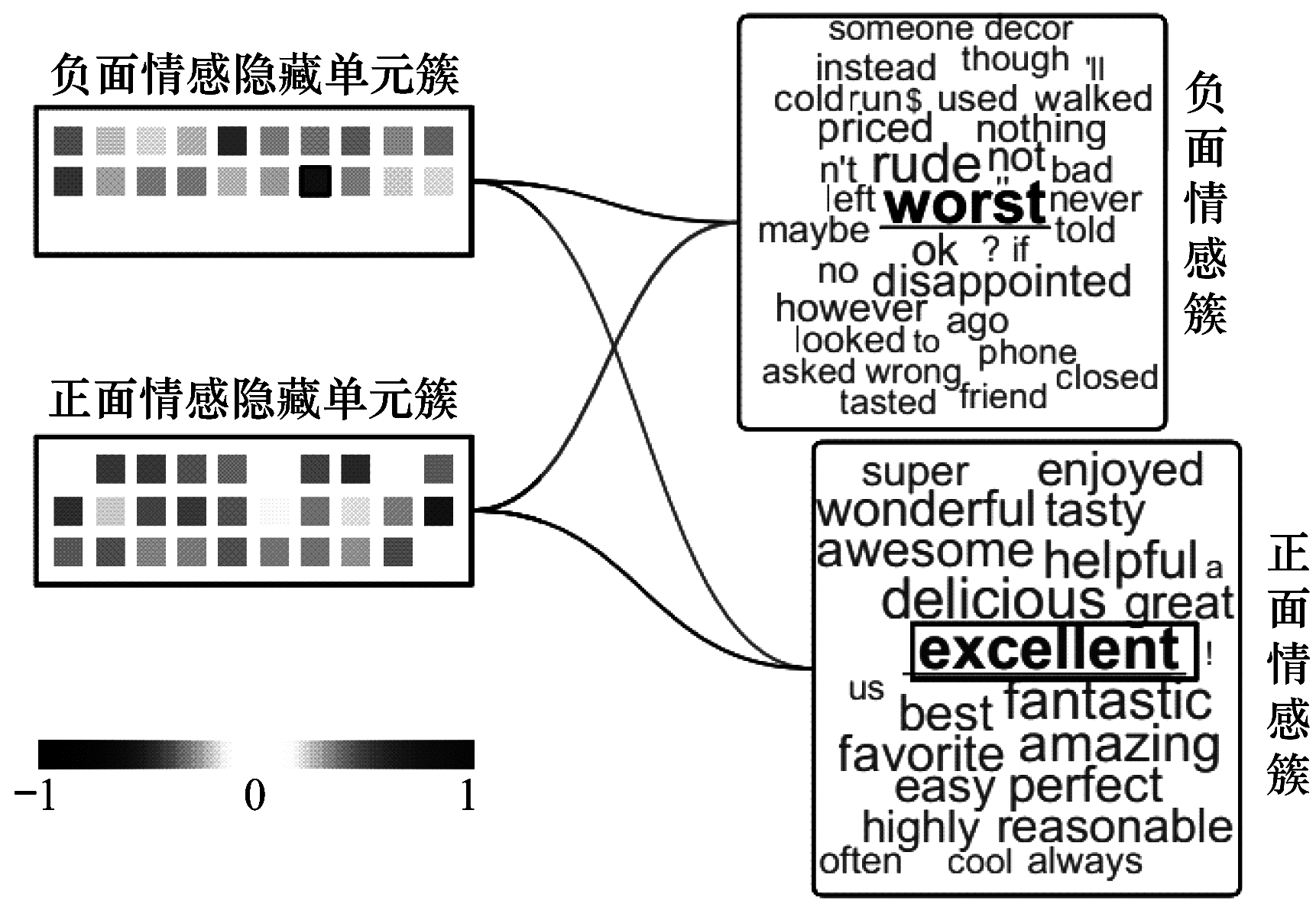 可视化的方法对理解RNN的特定方面非常有用。文献[57]使用静态可视化技术来帮助理解语言模型中的隐藏状态, 研究结果表明, 选定的单元格可以为明确的事件建模, 例如括号和统一资源定位符(Uniform Resource Locator, URL)的开头。文献[58]基于梯度的显著性来找到重要的单词, 使用表征标绘等传统方法和简单策略来评估神经元对于语义构建的贡献度。文献[57-60]证明了RNN学习携带语义信息的词汇类别和语法功能。LSTMVis是用于递归神经网络的可视化分析工具, 专注于了解这些隐藏的状态的动力学过程[61]。LISA用于解释决策并检测网络在决策制定时所依赖的最可能模式[62]。文献[63]提出可视化存储向量以理解LSTM和GRU在语音识别任务中的行为。RNNVis基于RNN对输入的预期响应来可视化隐藏状态, 当有负面词如worst输入时, 将大量激活负面情感隐藏单元簇, 对应于负面情感; 当有正面词如excellent输入时, 将大量激活正面情感隐藏单元簇, 对应于正面情感, 如图 10所示[64]。文献[65]研究了深度双向语言模型的内部状态, 以学习情境化的单词表示, 并观察到更高级别的隐藏状态捕获单词语义。LRP技术应用于基于单词的双向LSTM模型上的5类情感预测任务, 并定性和定量地评估所得的相关性[81]。