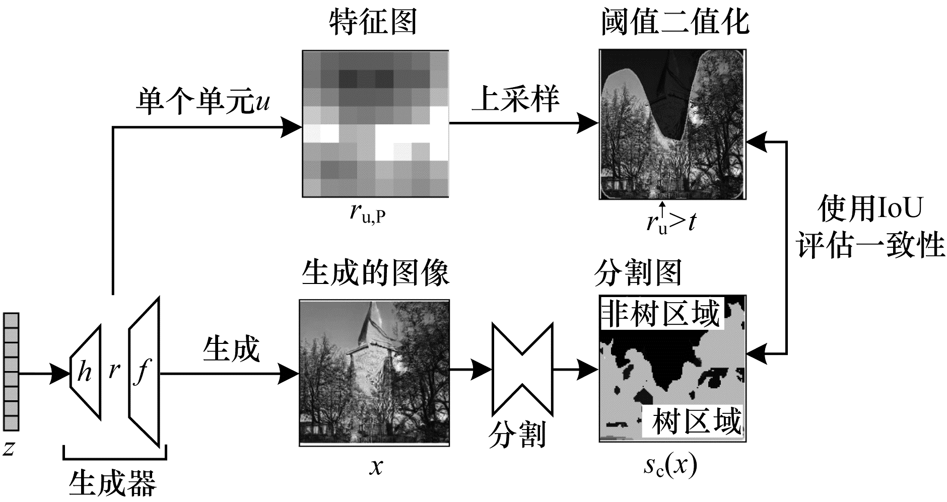 | 图 11 使用GAN剖析方法寻找语义类(树)生成单元示意图 Fig. 11 Schematic diagram of finding generator units that match meaningful object classes (like trees)using GAN dissection method | |