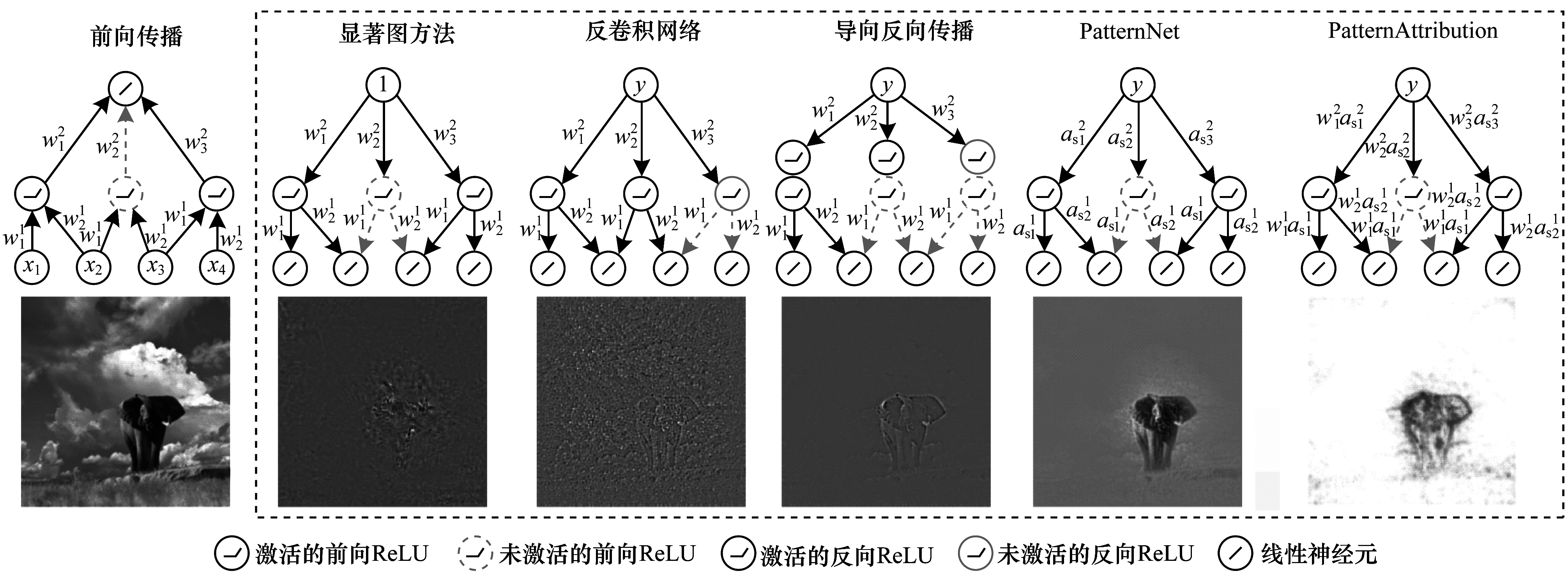 CNN内部可视化方法通过CNN内部卷积核可视化的方法来解释CNN内部所学到的图像表征。理解CNN内部网络的操作需要追踪多层网络中每一层的特征状态, 而中间层的状态可以通过反卷积网络(Deconvolutional Network)[30]技术反向映射回输入层的图像像素空间。反卷积网络可以理解成另一个反向的CNN, 其具有同样的网络结构, 包括卷积元、池化层等。反卷积网络主要作用是把CNN从像素学会的特征还原成可以从任意一个输出层或者中间层反推到输入层的对应像素。反卷积网络清楚地证明了CNN高效的学习能力:通过学习图像中物体从小至大的特征而归纳出物体的整体特征, CNN网络中海量的内部隐藏特征元并不是随机的。该结论极大地加深了使用者对于CNN模型的理解, 从而进一步信任模型的结果。反卷积网络除了可以观察解释CNN内部结构外, 还可以用来解决模型建立和调试时遇到的问题, 并通过分析内部结果得到更好的模型。另一种替代方法是不使用简单的反向传播, 而是使用导向反向传播(Guided Back Propagation)算法[76]。这种技术不仅能够识别一个修正线性单元(Rectified Linear Unit, ReLU)是否被激活, 而且可以识别所有值为负的梯度。在此基础上, 把所有不被激活的修正线性单元ReLU关闭, 并且把所有反向传播时遇到的负信号设置为阈值0, 更符合ReLU在前向传播时的特性。通过去除所有负梯度对所选神经元造成的影响, 只保留正面的影响, 反向传播最后获得的图片更加清晰。