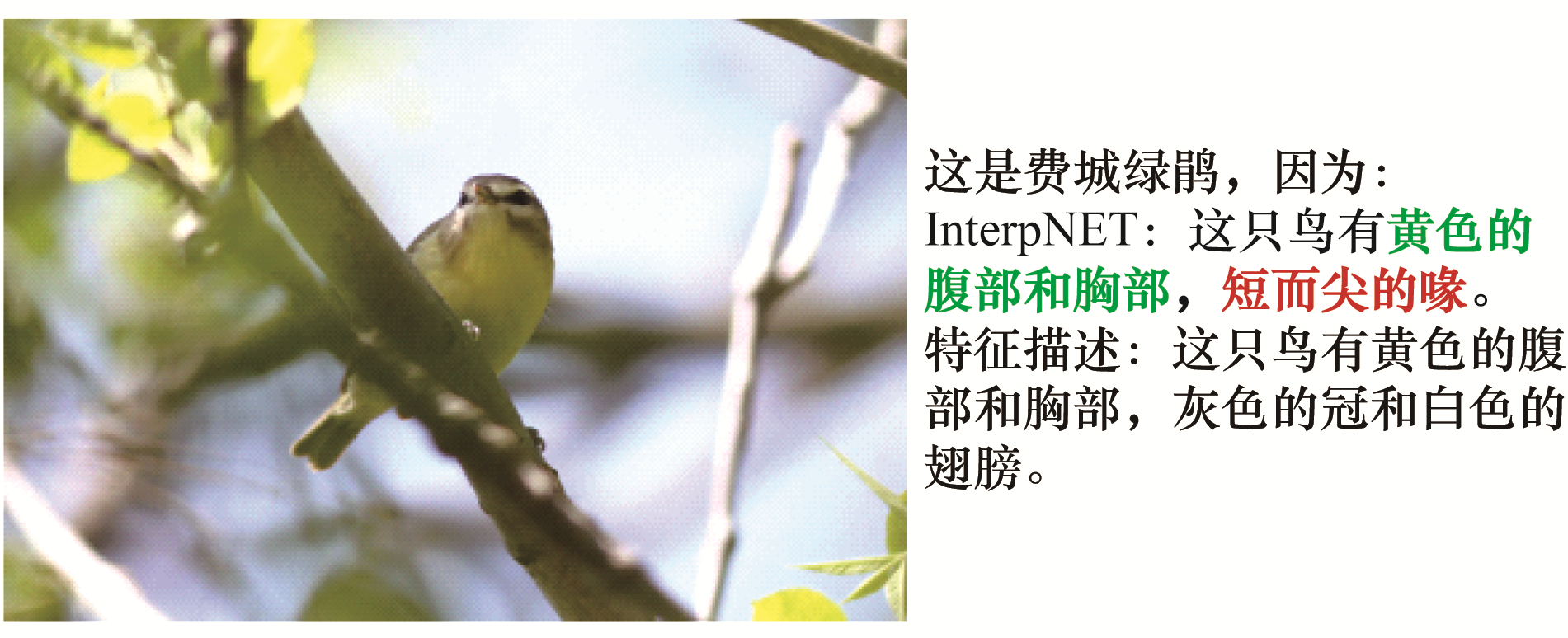 | 图 8 鸟类图像分类的文本解释方法示意图 Fig. 8 Schematic diagram of text interpretation method for bird image classification | |