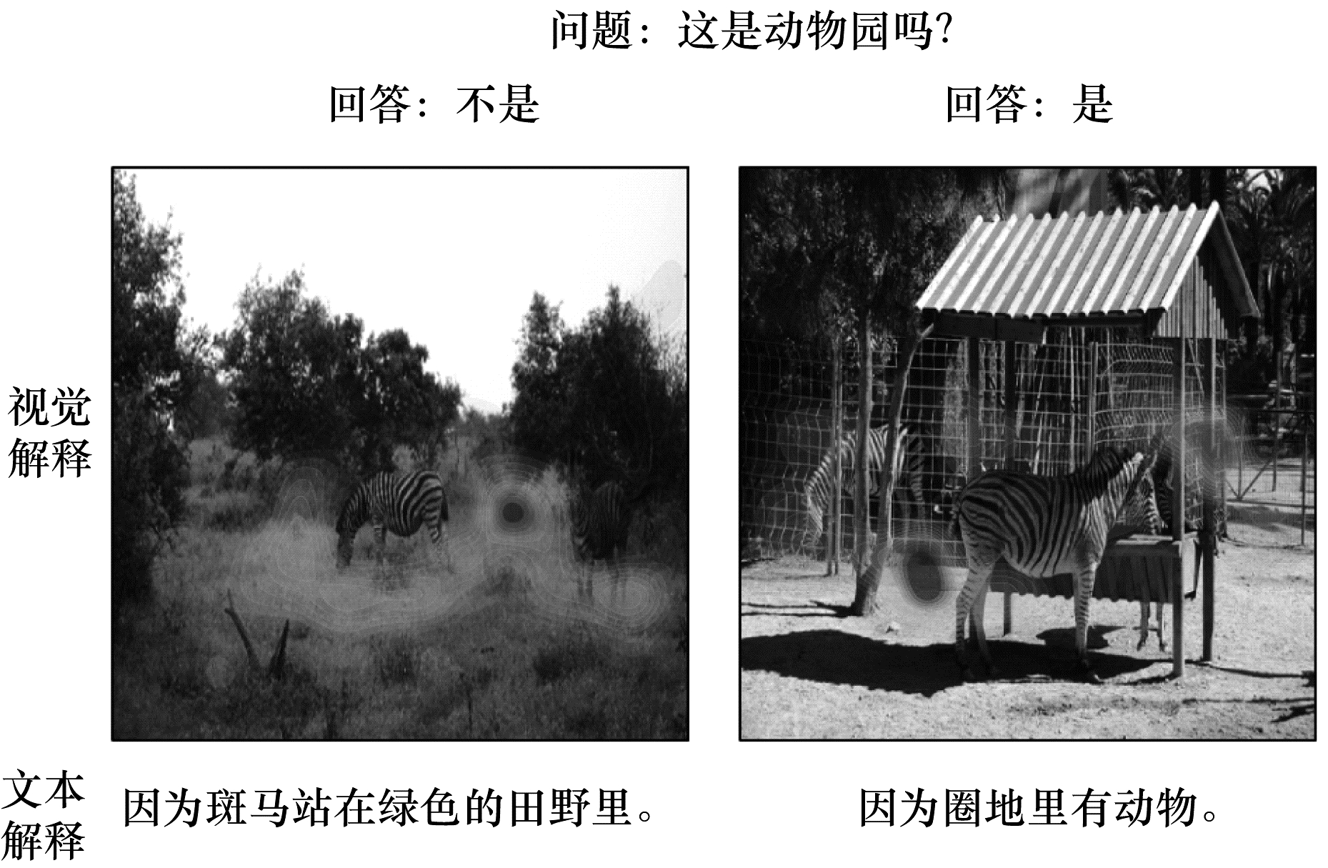 多模态解释方法不但为模型决策生成文本解释, 而且在图像上生成对应的视觉证据区域, 如图 9所示。PJ-X模型使用注意力机制构建模型生成决策结果的视觉解释, 对结果生成文本描述的自然语言解释, 并在视觉问题任务和活动识别任务上进行了验证[55-56]。MDNet是一个能够具有在语义上和视觉上为可解释性的医学图像诊断网络, 给定一张医学图像, MDNet能够自动生成完整的诊断报告同时在描述图像时显示图像关注区[9]。文献[10]针对自动驾驶任务, 采用视觉注意力模型训练卷积神经网络端到端的学习图像至控制命令, 然后利用基于注意力的视频转文本模型生成模型行为的文本解释。