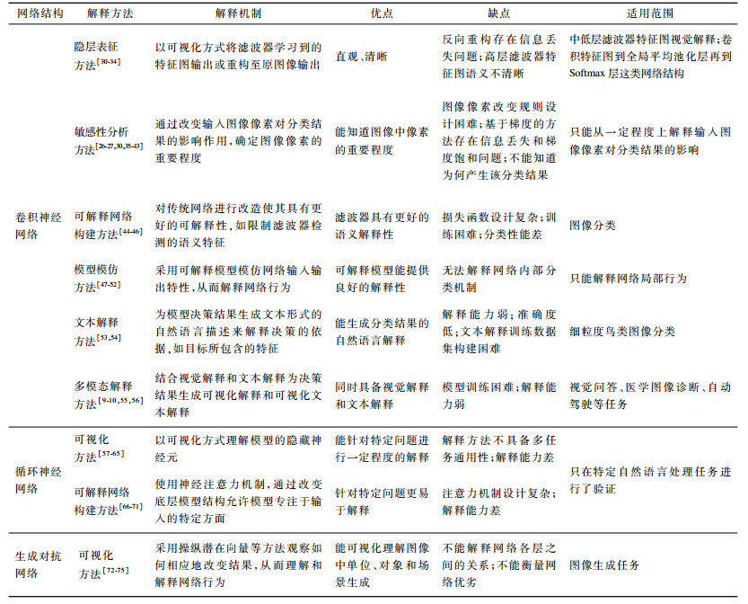 随着深度神经网络研究的深入和广泛应用, 新的网络结构和解释方法不断出现和发展, 对这些工作进行梳理分析和总结有助于把握深度神经网络可解释问题的最新研究进展和发展趋势。因此, 学术界和工业界学者都在各自领域内针对深度神经网络的可解释性问题进行深入研究和探索[12-13, 20, 22, 24, 28-29], 如表 1所示, 当前深度神经网络解释方法研究主要针对不同的网络结构, 其中卷积神经网络(Convolutional Neural Networks, CNN)解释方法成果较多, 循环神经网络(Recurrent Neural Networks, RNN)和生成对抗网络随着深入研究和广泛应用, 其解释方法也逐渐引起了研究人员的注意, 成为未来解释方法研究的发展趋势。从解释的形式来看, 多数方法提供视觉解释, 采用可视化的方法向用户提供决策的依据, 如高亮图像区域或文本的关键字符等。另外一些方法试图提供自然语言描述语义的文本解释, 描述做出决策的关键特征。多模态的解释方法同时提供视觉解释和文本解释, 是一种较为完备的解释模式。